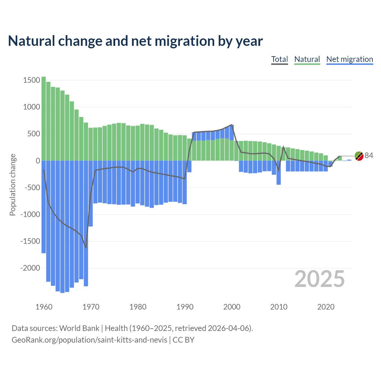 Over the last 10 years, 44.9% of the population change in Saint Kitts and Nevis is from natural causes (a gain of 1,225 people) and 55.1% is from migration (a loss of 1,506 people).