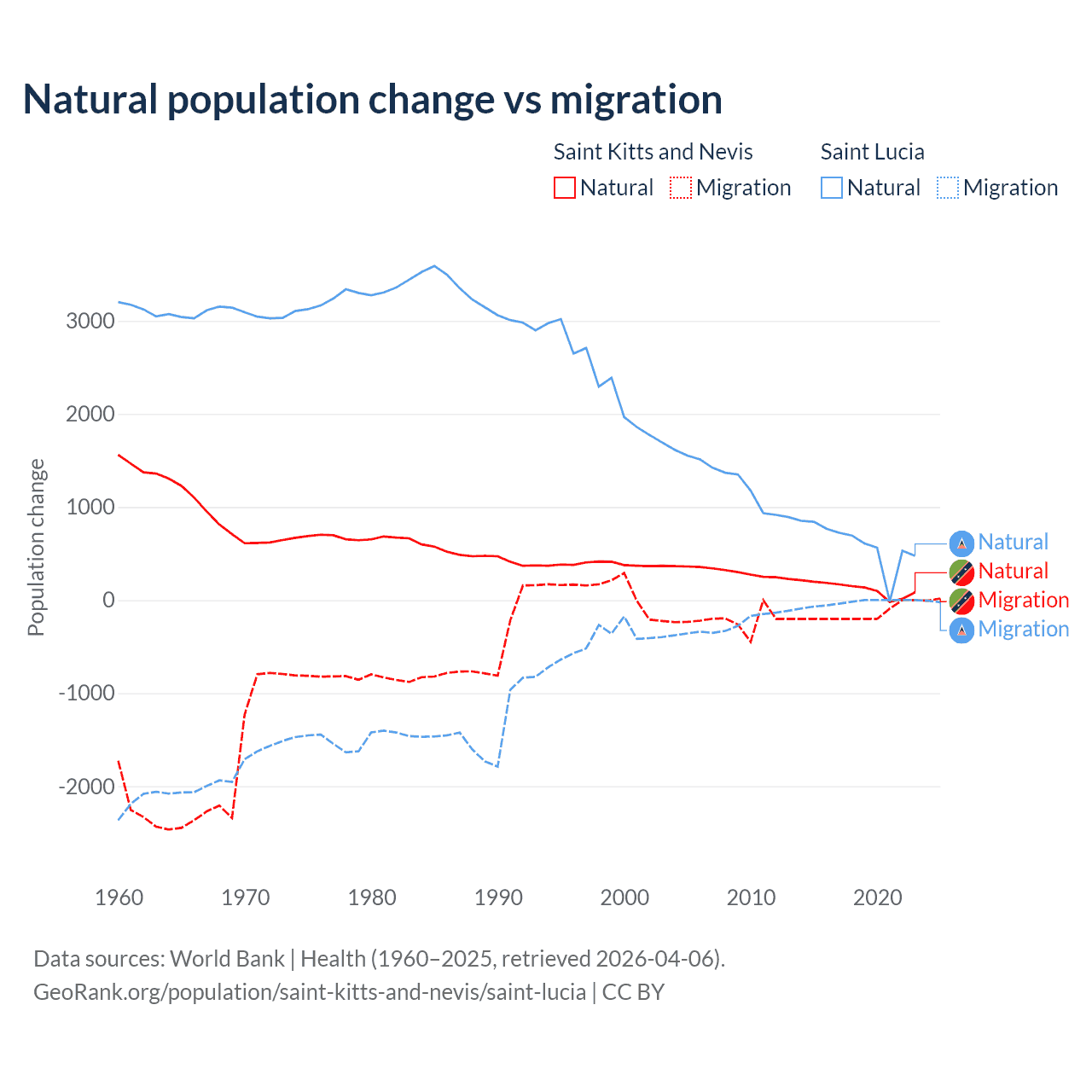 Over the last 10 years, 44.9% of the population change in Saint Kitts and Nevis is from natural causes (a gain of 1,225 people) and 55.1% is from migration (a loss of 1,506 people). In Saint Lucia 95.7% is from natural causes (a gain of 6,039 people) and 4.31% is from migration (a loss of 272 people).