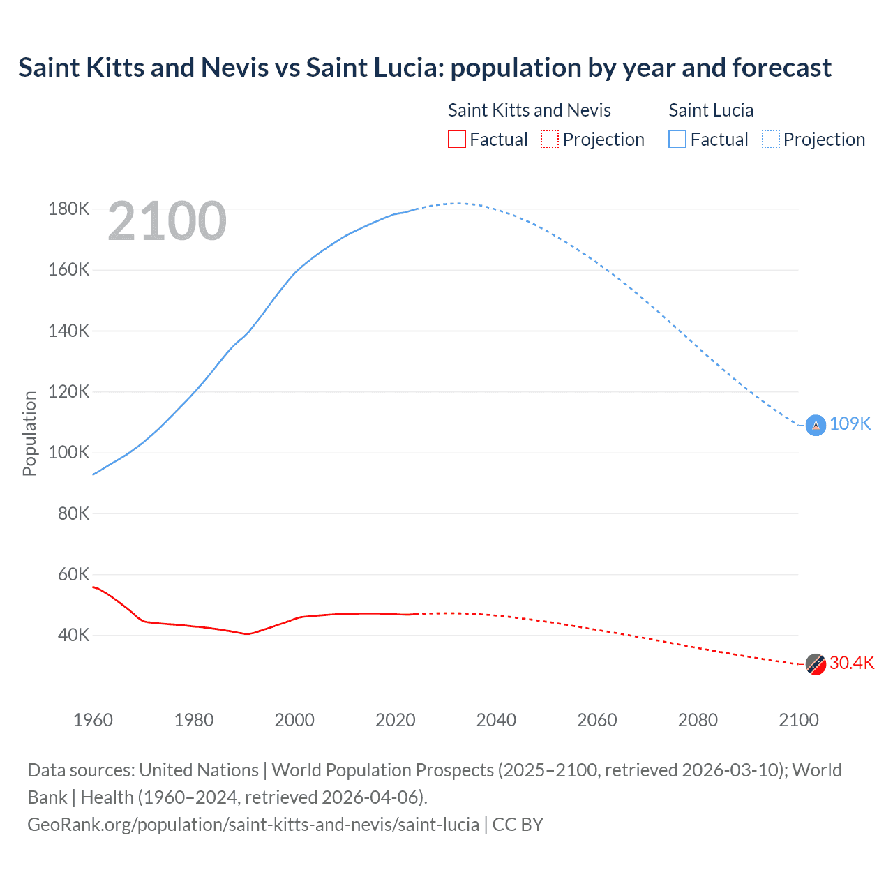 Saint Kitts and Nevis vs Saint Lucia: population by year and forecast