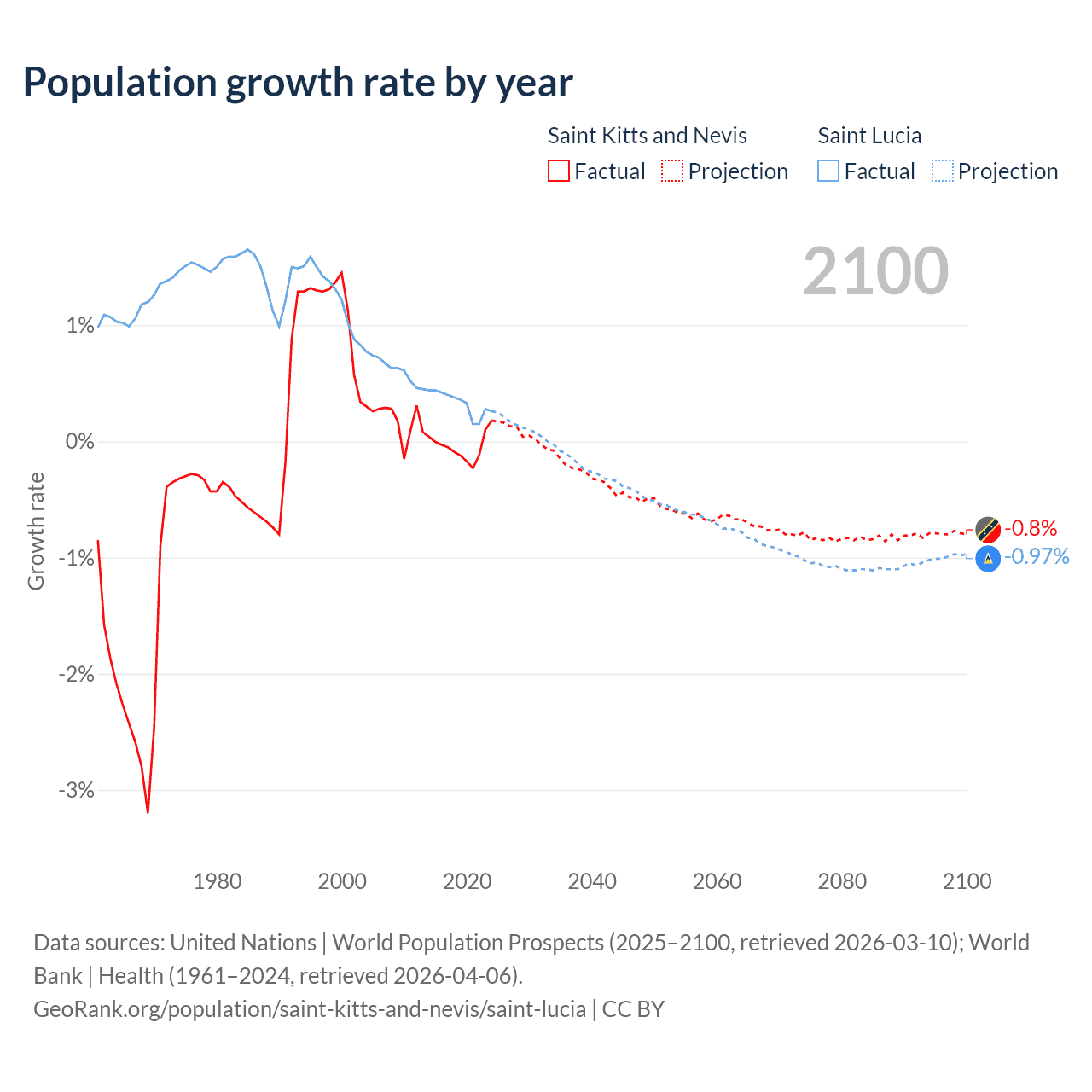 - For the last 10 years, Saint Kitts and Nevis has had an average growth rate of -0.04% per year vs +0.33% in Saint Lucia.