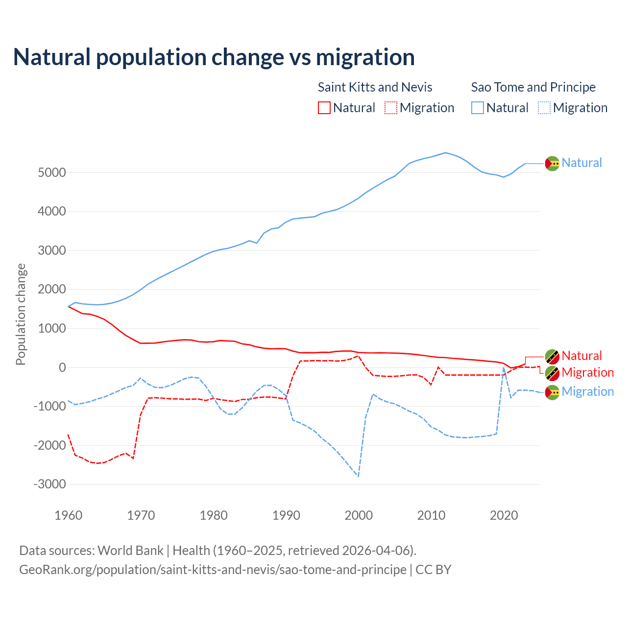 Over the last 10 years, 44.9% of the population change in Saint Kitts and Nevis is from natural causes (a gain of 1,225 people) and 55.1% is from migration (a loss of 1,506 people). In Sao Tome and Principe 80.1% is from natural causes (a gain of 50,822 people) and 19.9% is from migration (a loss of 12,621 people).