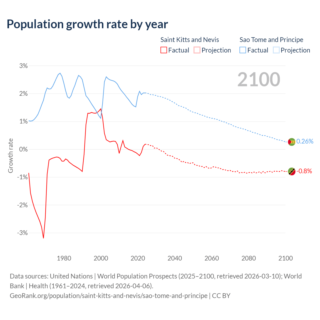 - For the last 10 years, Saint Kitts and Nevis has had an average growth rate of -0.04% per year vs +1.82% in Sao Tome and Principe.