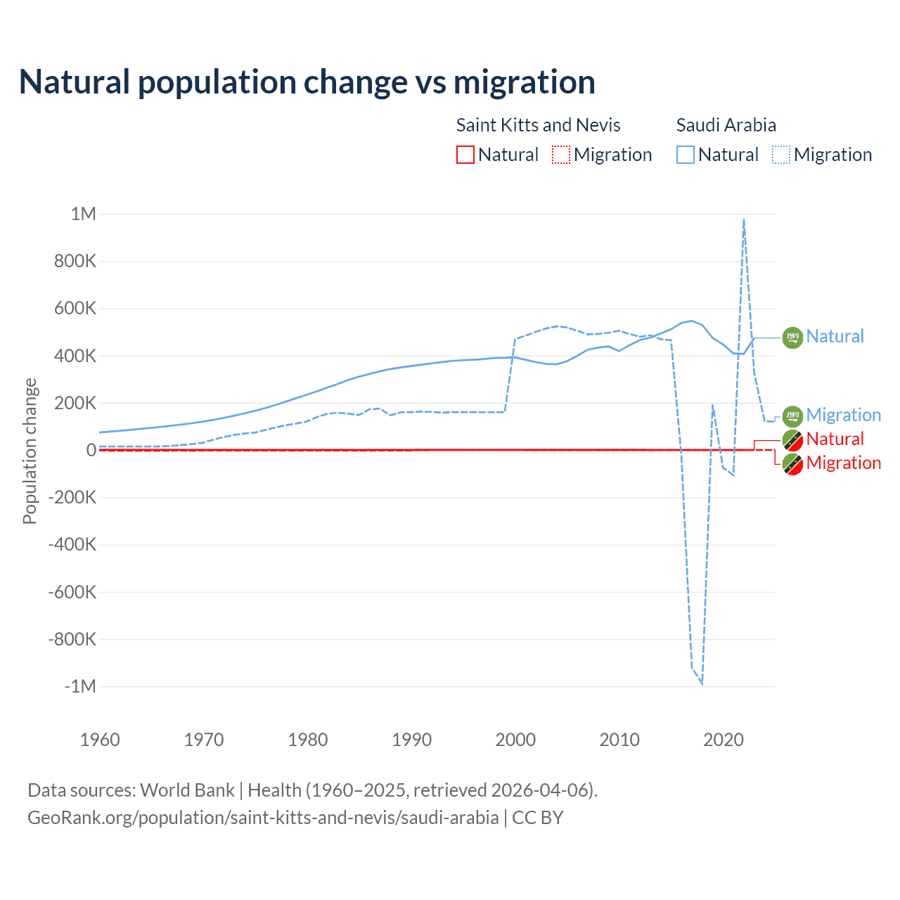 Over the last 10 years, 44.9% of the population change in Saint Kitts and Nevis is from natural causes (a gain of 1,225 people) and 55.1% is from migration (a loss of 1,506 people). In Saudi Arabia 93.9% is from natural causes (a gain of 4,829,562 people) and 6.05% is from migration (a gain of 311,209 people).
