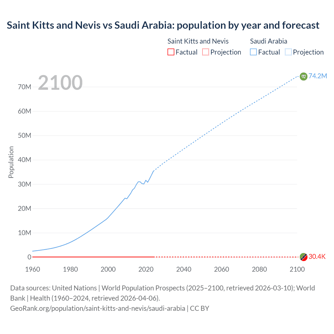 Saint Kitts and Nevis vs Saudi Arabia: population by year and forecast
