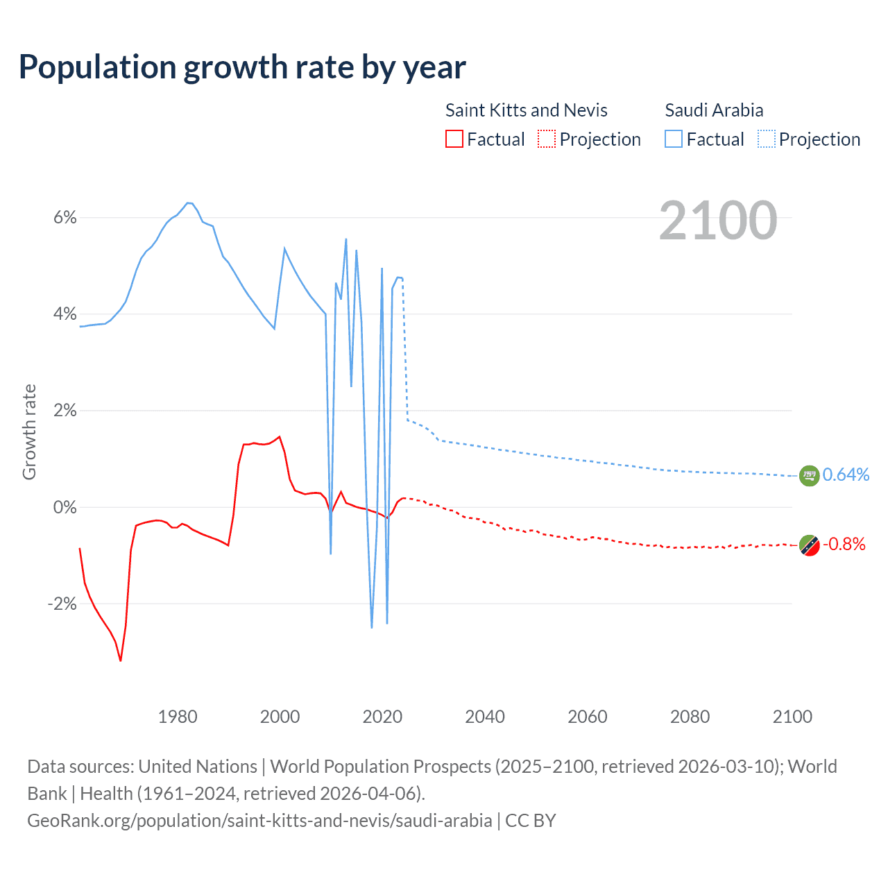 - For the last 10 years, Saint Kitts and Nevis has had an average growth rate of -0.04% per year vs +2.3% in Saudi Arabia.