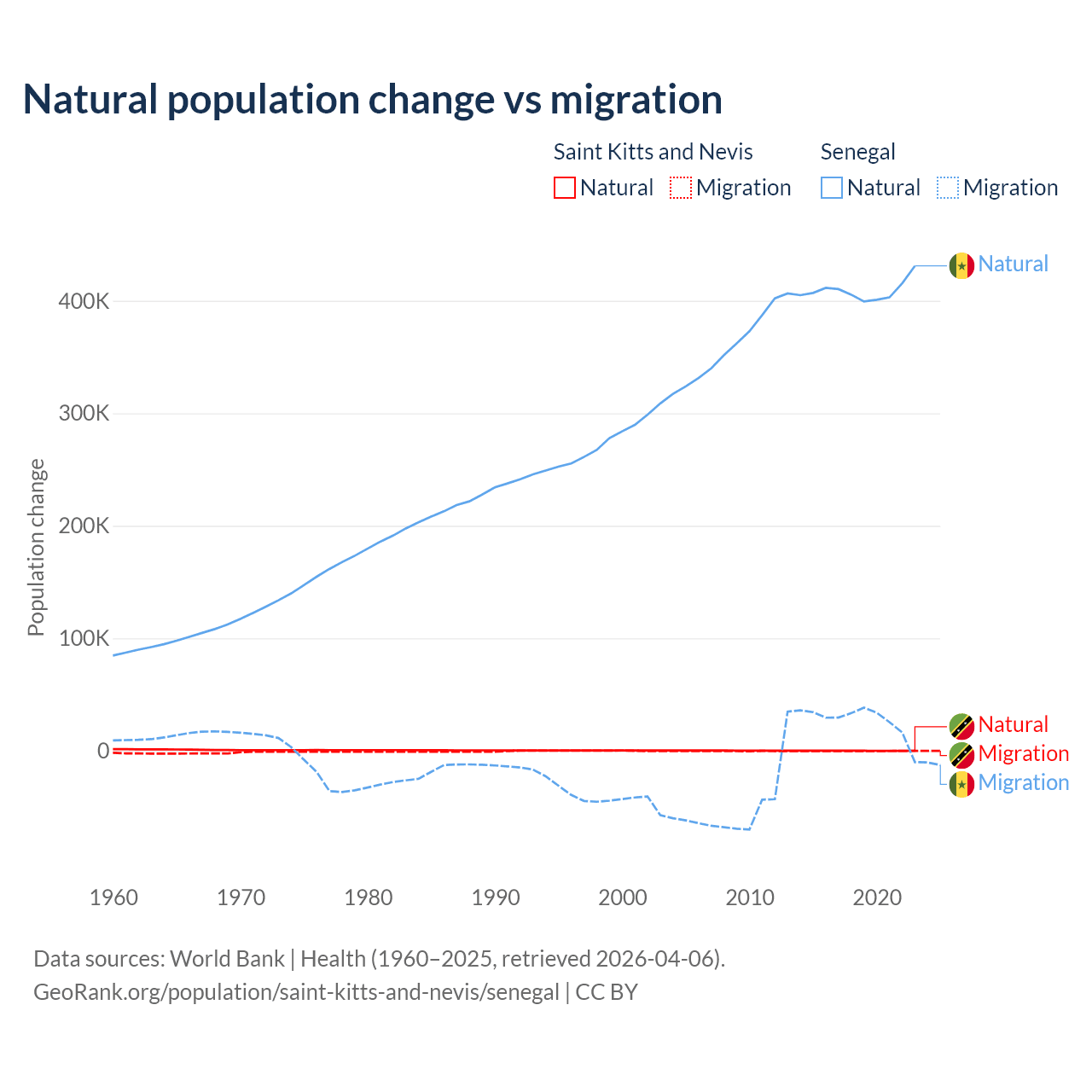 Over the last 10 years, 44.9% of the population change in Saint Kitts and Nevis is from natural causes (a gain of 1,225 people) and 55.1% is from migration (a loss of 1,506 people). In Senegal 93.9% is from natural causes (a gain of 4,089,205 people) and 6.13% is from migration (a gain of 267,266 people).
