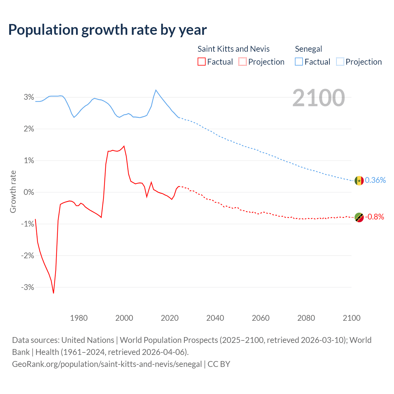 - For the last 10 years, Saint Kitts and Nevis has had an average growth rate of -0.04% per year vs +2.76% in Senegal.
