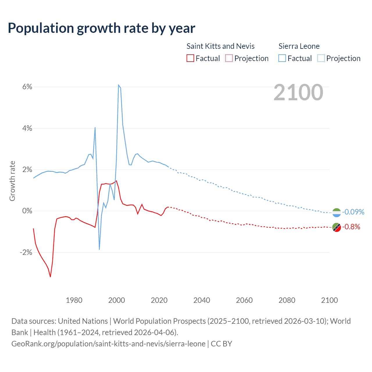 - For the last 10 years, Saint Kitts and Nevis has had an average growth rate of -0.04% per year vs +2.32% in Sierra Leone.