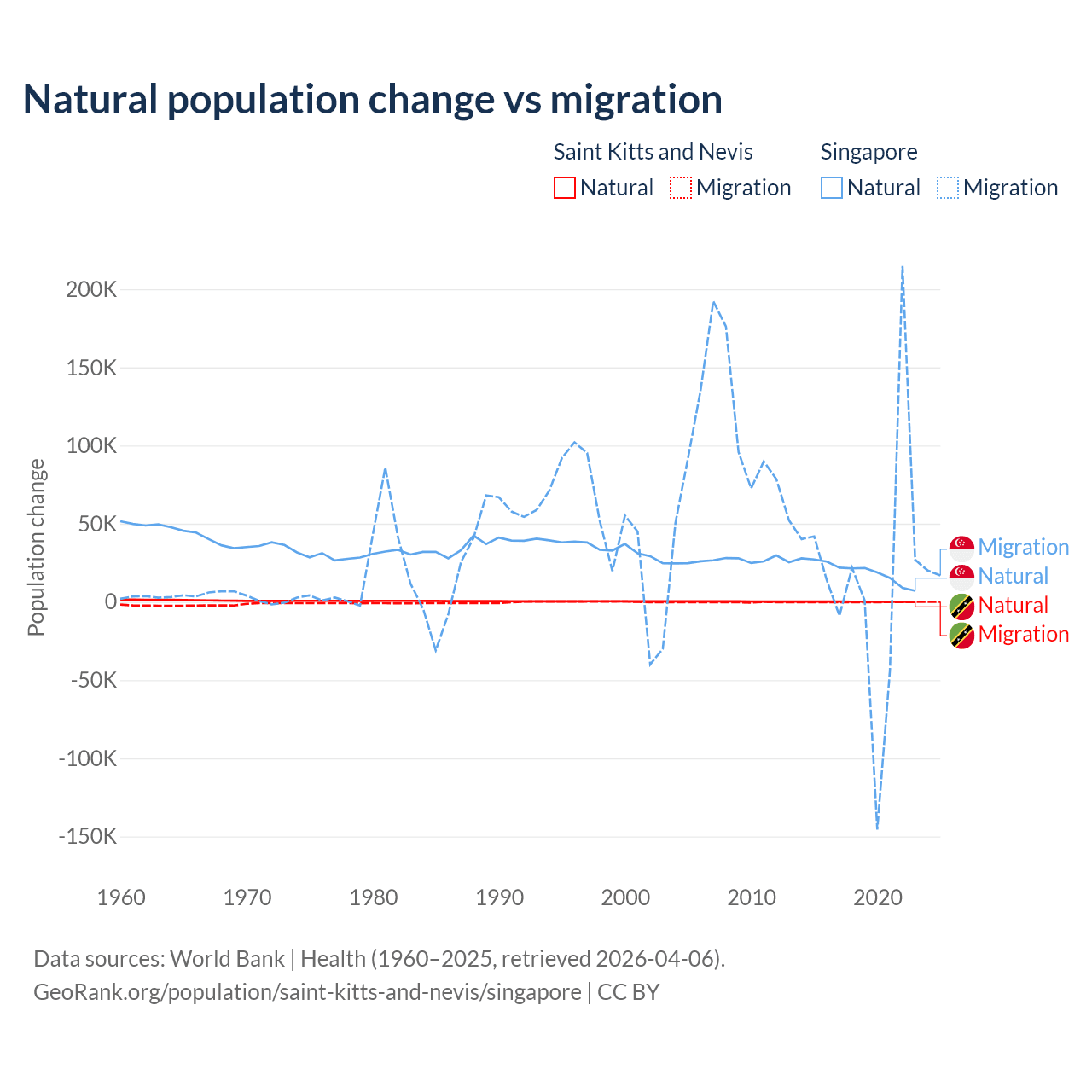 Over the last 10 years, 44.9% of the population change in Saint Kitts and Nevis is from natural causes (a gain of 1,225 people) and 55.1% is from migration (a loss of 1,506 people). In Singapore 54.8% is from natural causes (a gain of 195,953 people) and 45.2% is from migration (a gain of 161,805 people).