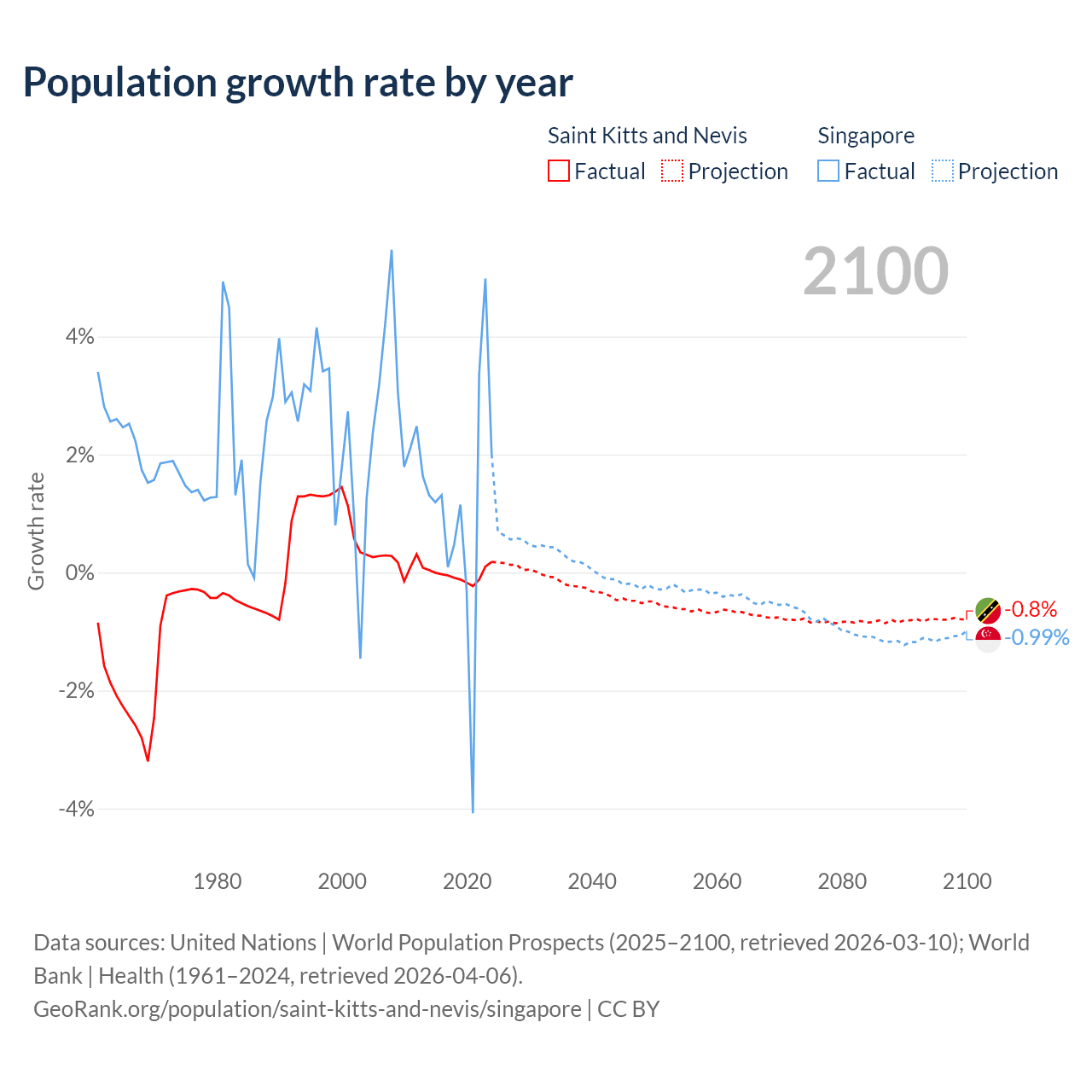 - For the last 10 years, Saint Kitts and Nevis has had an average growth rate of -0.04% per year vs +1.04% in Singapore.
