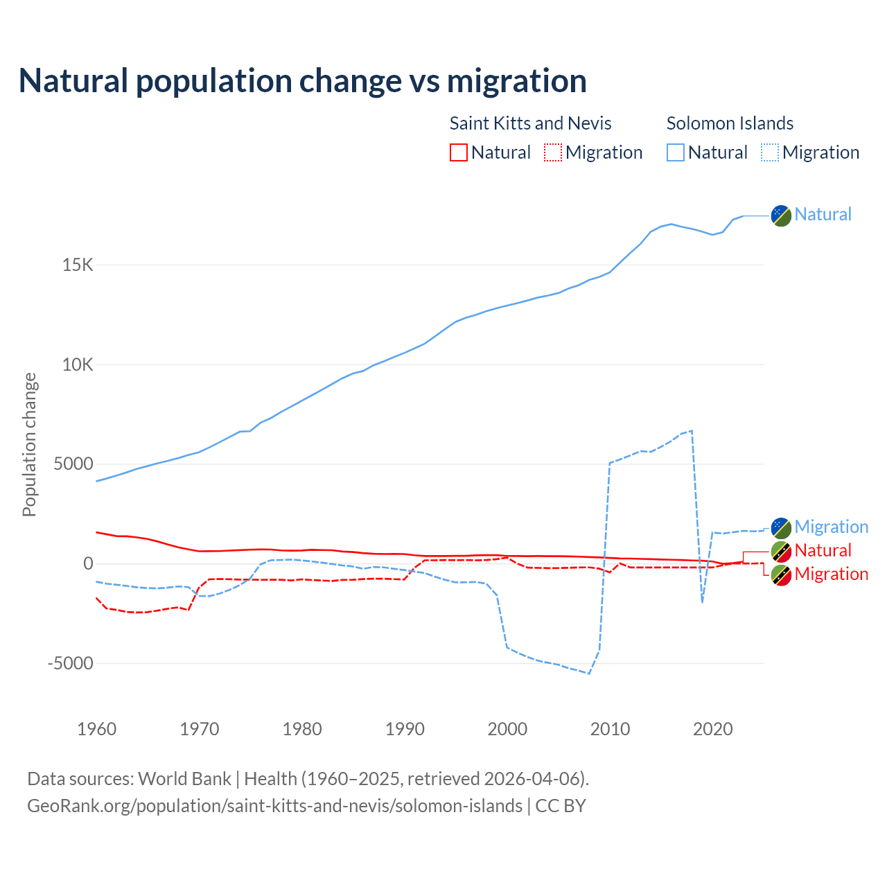 Over the last 10 years, 44.9% of the population change in Saint Kitts and Nevis is from natural causes (a gain of 1,225 people) and 55.1% is from migration (a loss of 1,506 people). In the Solomon Islands 82.8% is from natural causes (a gain of 168,727 people) and 17.2% is from migration (a gain of 35,031 people).