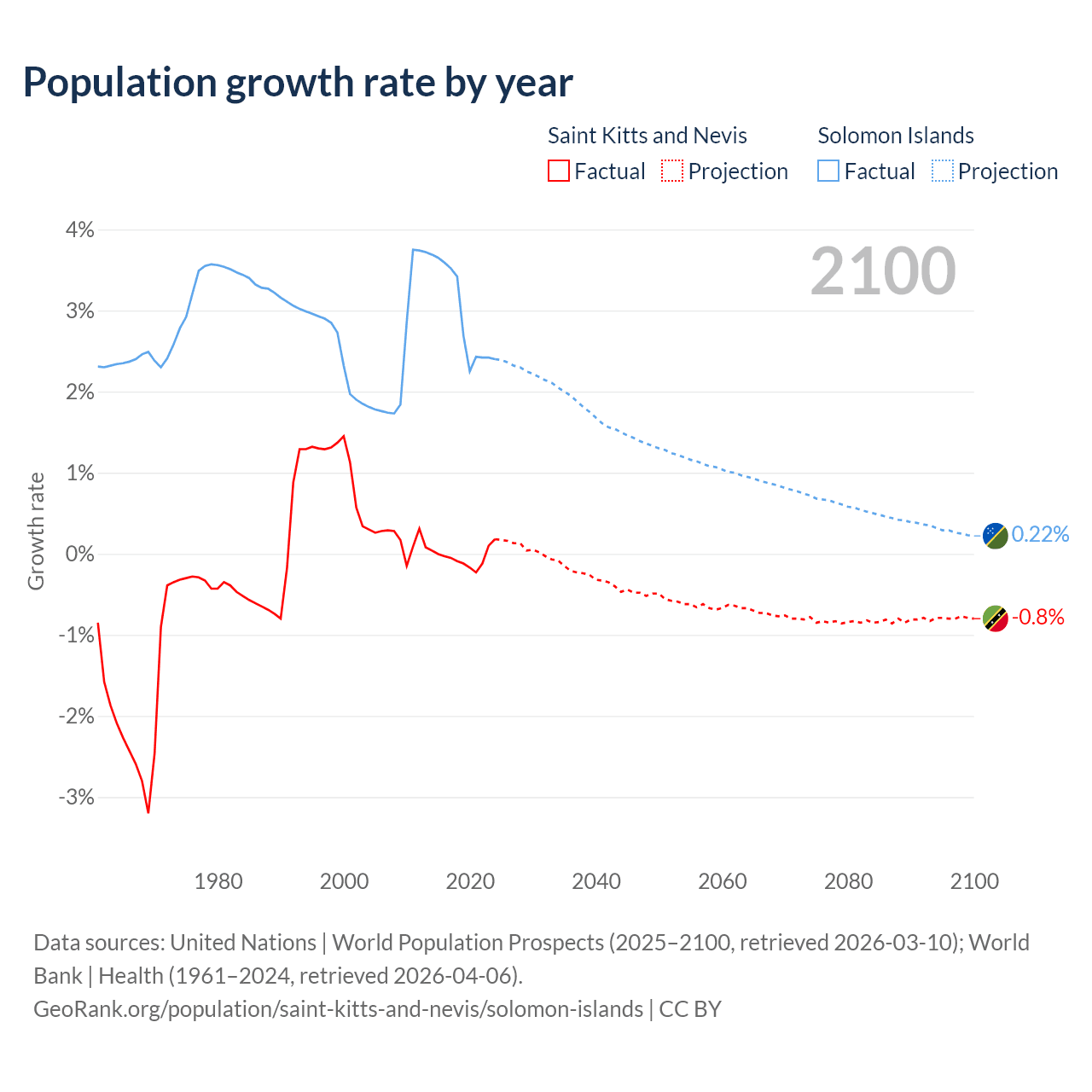 - For the last 10 years, Saint Kitts and Nevis has had an average growth rate of -0.04% per year vs +2.95% in the Solomon Islands.