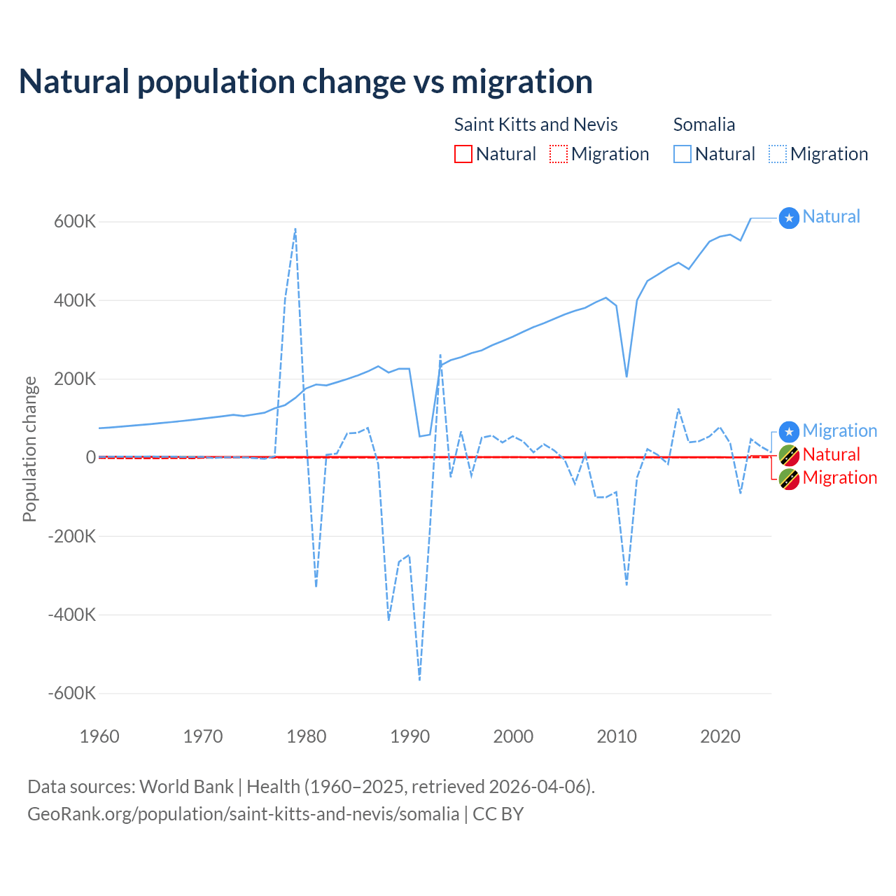 Over the last 10 years, 44.9% of the population change in Saint Kitts and Nevis is from natural causes (a gain of 1,225 people) and 55.1% is from migration (a loss of 1,506 people). In Somalia 94.4% is from natural causes (a gain of 5,270,105 people) and 5.58% is from migration (a gain of 311,487 people).