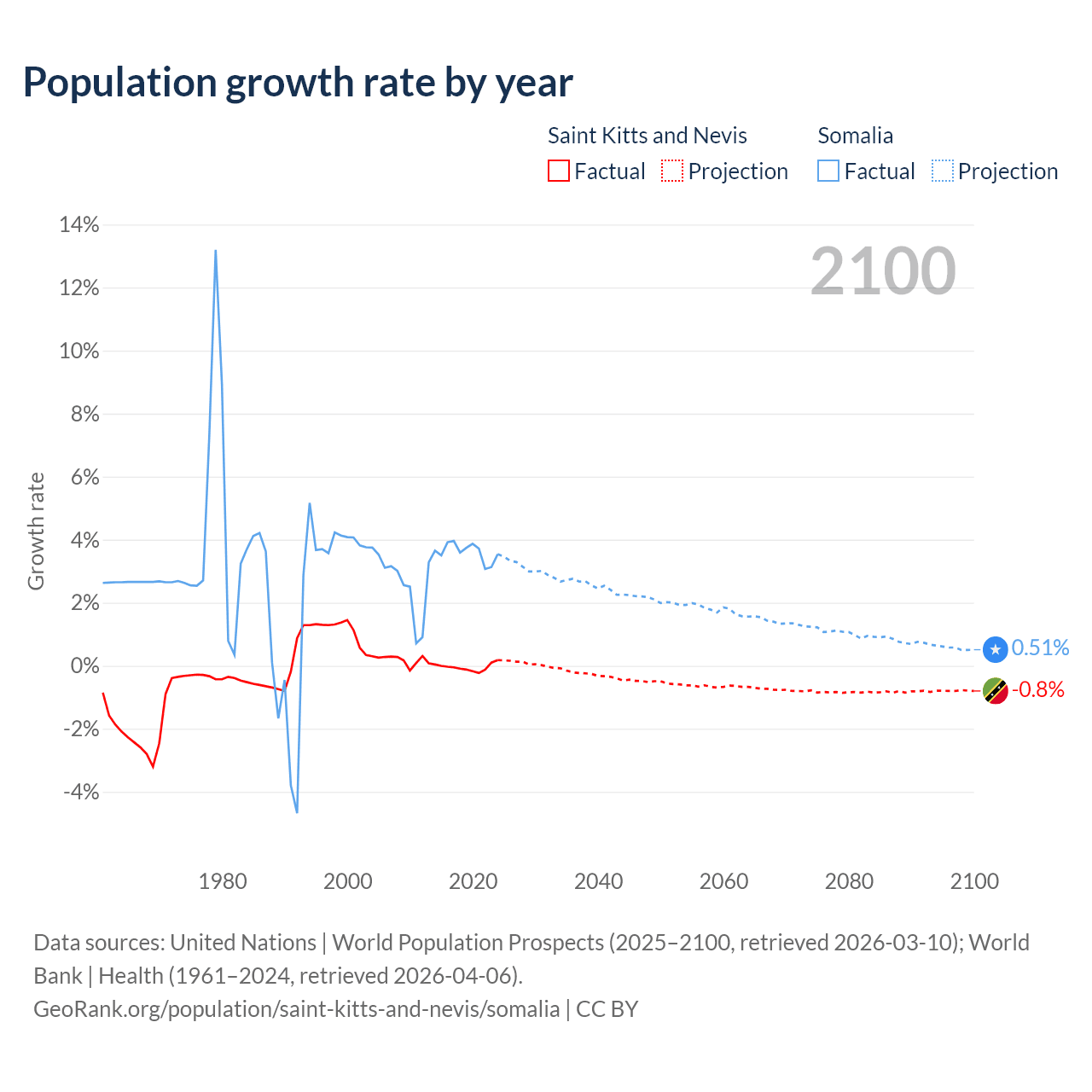 - For the last 10 years, Saint Kitts and Nevis has had an average growth rate of -0.04% per year vs +3.61% in Somalia.