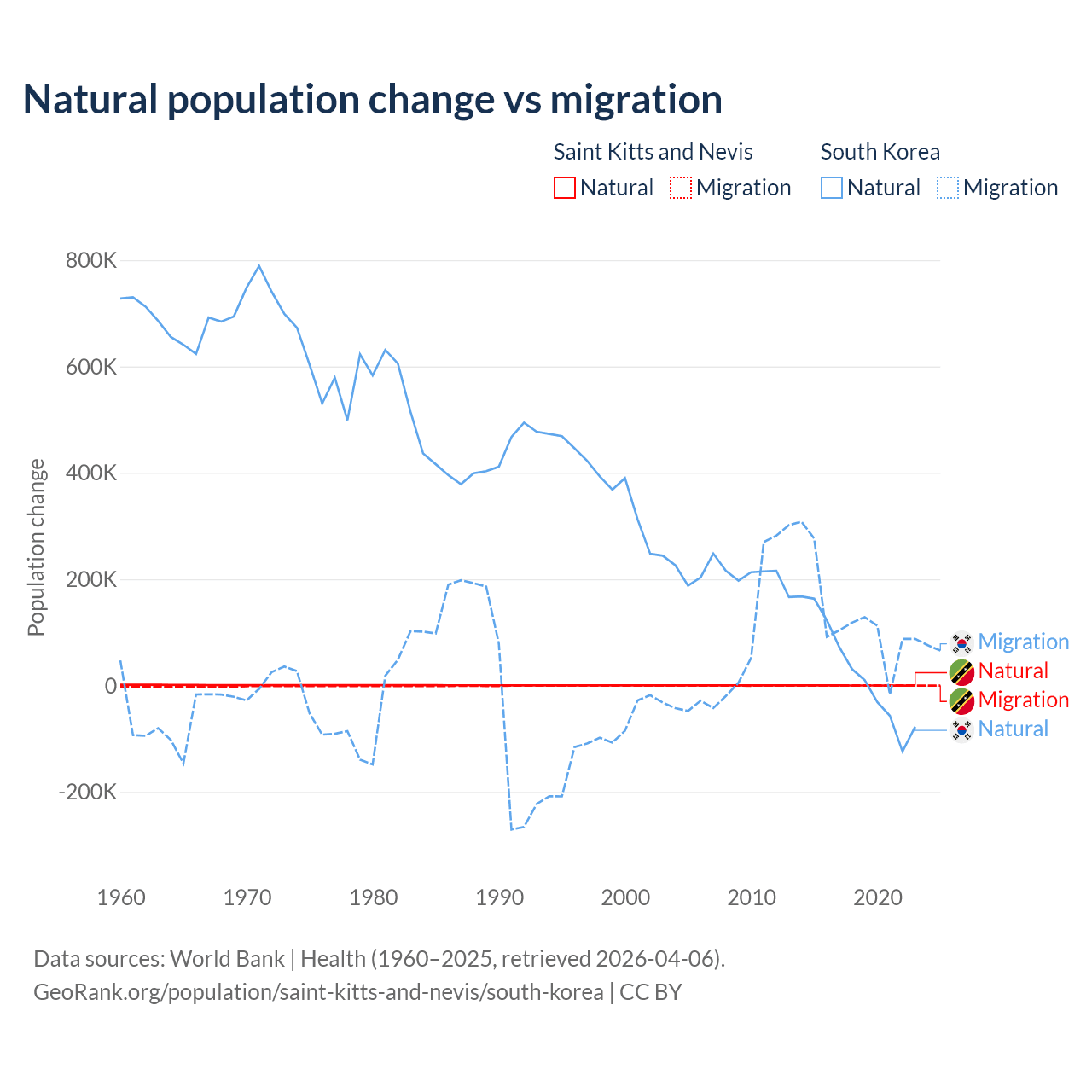 Over the last 10 years, 44.9% of the population change in Saint Kitts and Nevis is from natural causes (a gain of 1,225 people) and 55.1% is from migration (a loss of 1,506 people). In South Korea 17.6% is from natural causes (a gain of 277,215 people) and 82.4% is from migration (a gain of 1,298,356 people).
