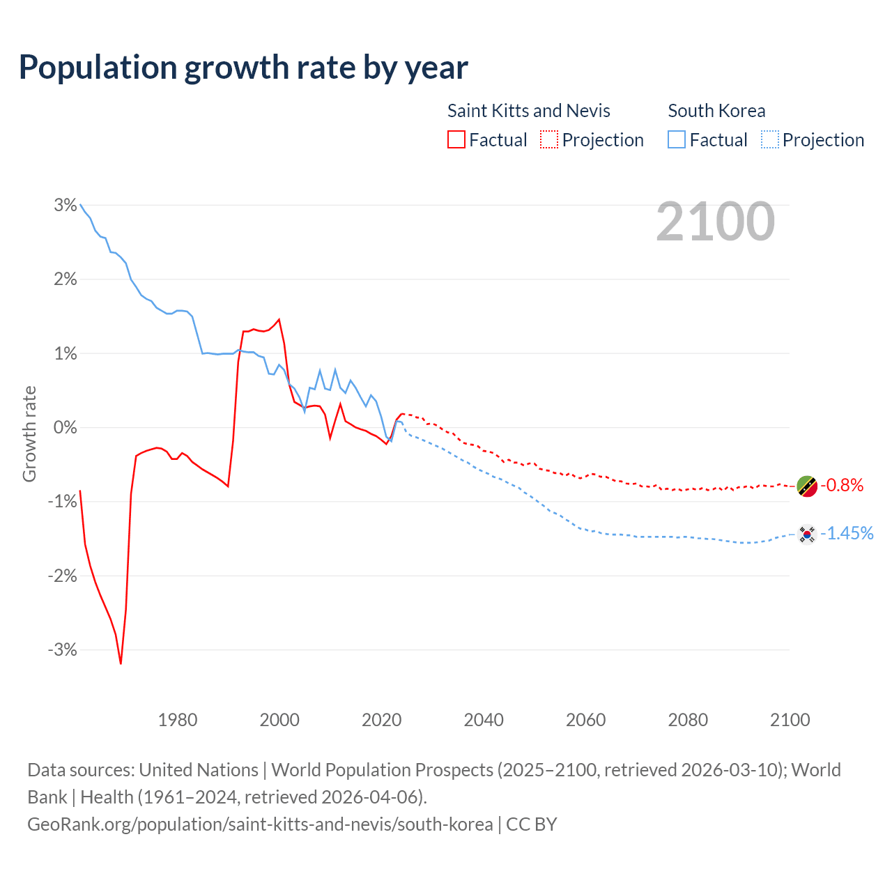 - For the last 10 years, Saint Kitts and Nevis has had an average growth rate of -0.04% per year vs +0.24% in South Korea.