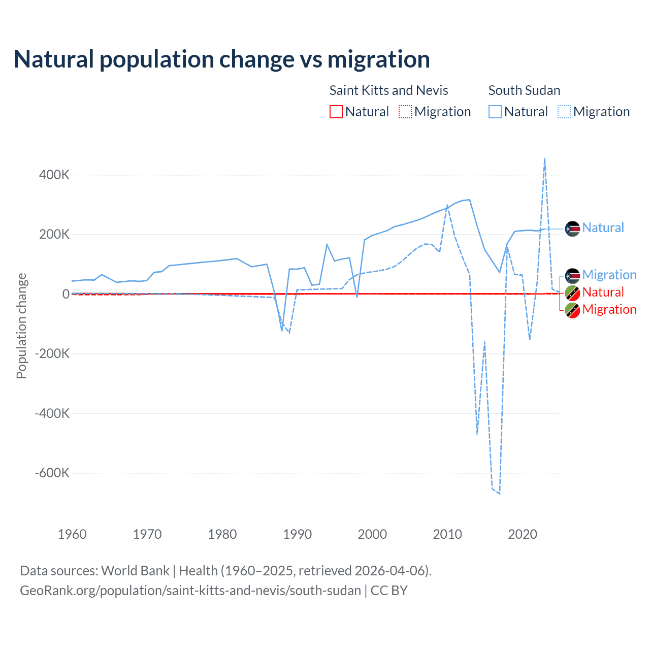 Over the last 10 years, 44.9% of the population change in Saint Kitts and Nevis is from natural causes (a gain of 1,225 people) and 55.1% is from migration (a loss of 1,506 people). In South Sudan 57.4% is from natural causes (a gain of 1,792,135 people) and 42.6% is from migration (a loss of 1,329,606 people).