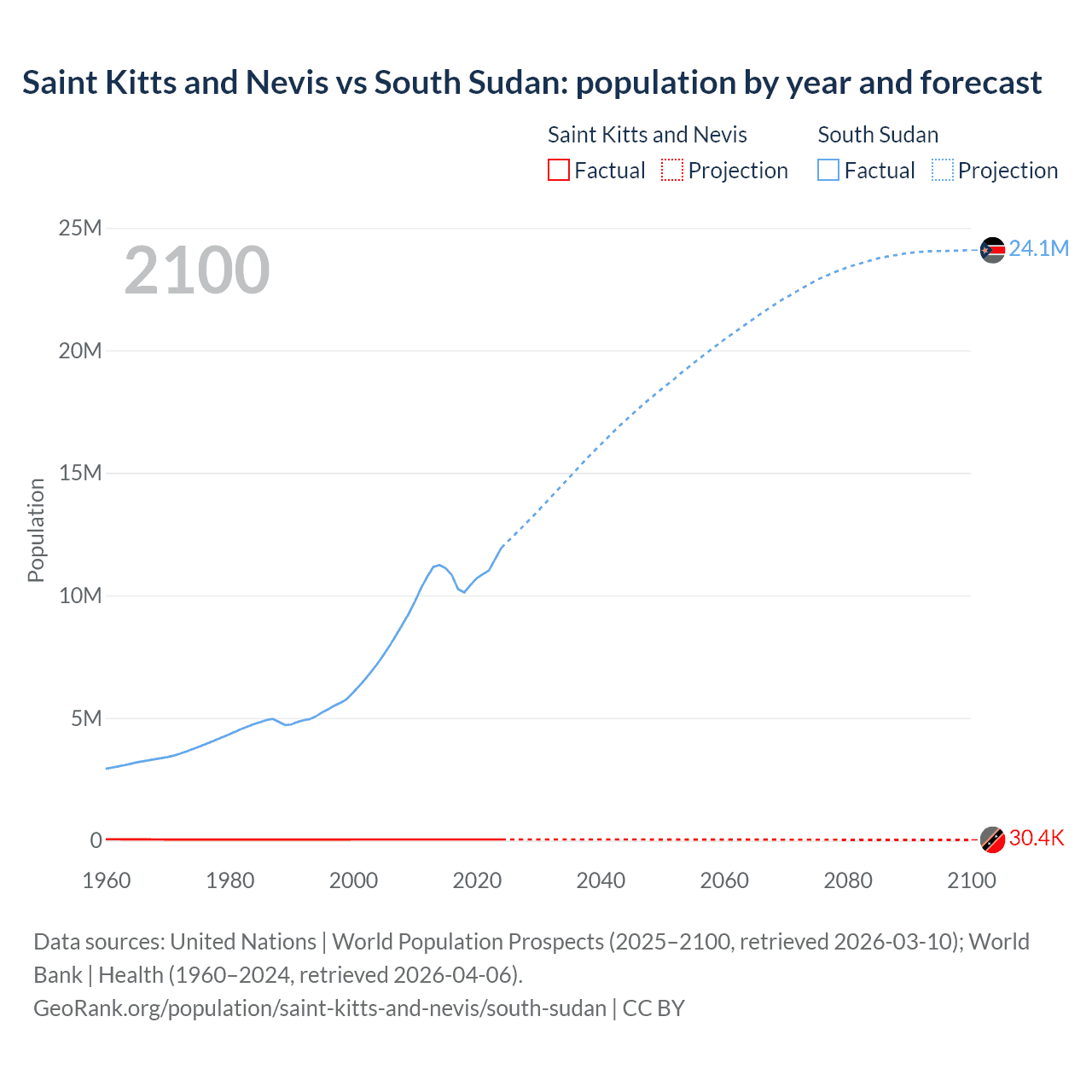 Saint Kitts and Nevis vs South Sudan: population by year and forecast
