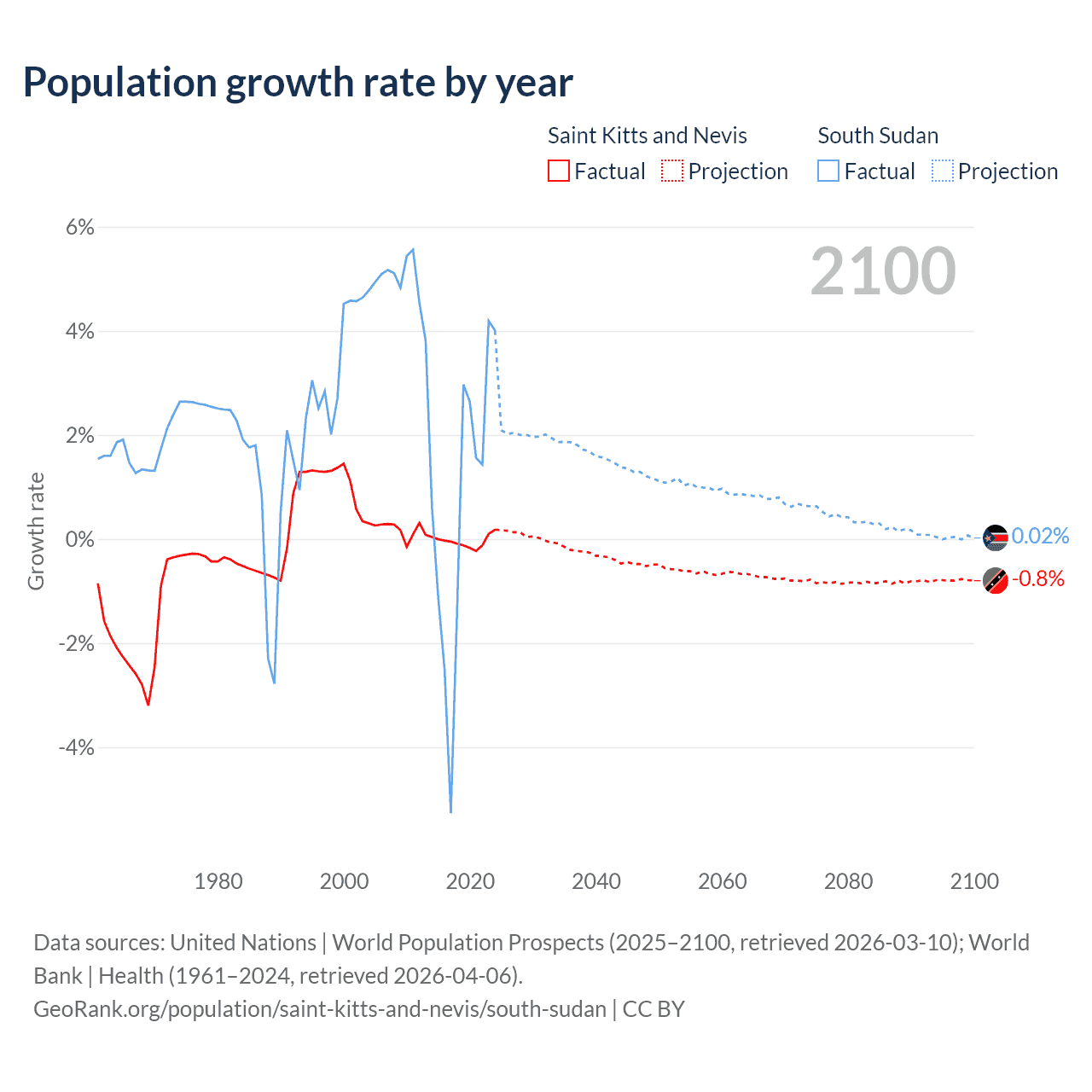 - For the last 10 years, Saint Kitts and Nevis has had an average growth rate of -0.04% per year vs +0.65% in South Sudan.