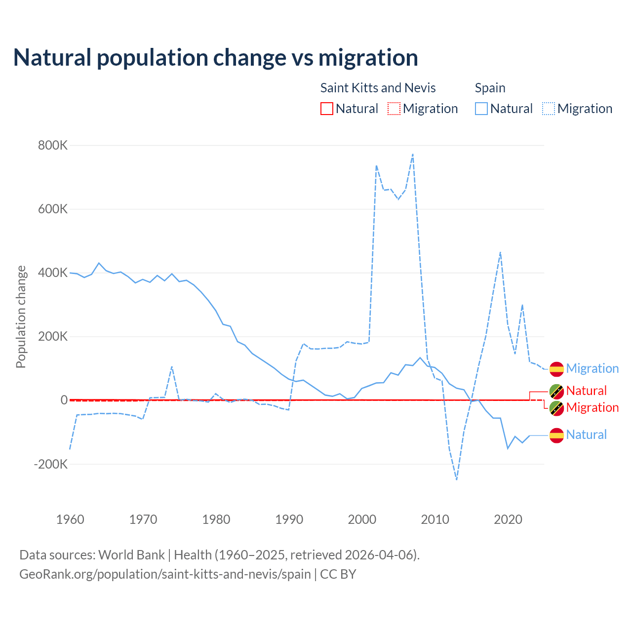 Over the last 10 years, 44.9% of the population change in Saint Kitts and Nevis is from natural causes (a gain of 1,225 people) and 55.1% is from migration (a loss of 1,506 people). In Spain 25.8% is from natural causes (a loss of 627,829 people) and 74.2% is from migration (a gain of 1,810,127 people).