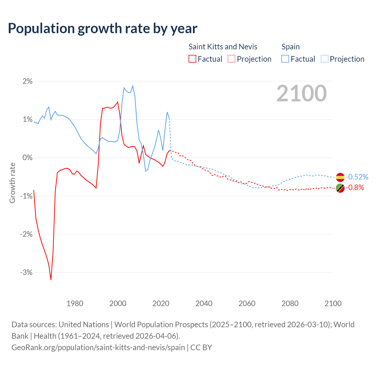- For the last 10 years, Saint Kitts and Nevis has had an average growth rate of -0.04% per year vs +0.43% in Spain.