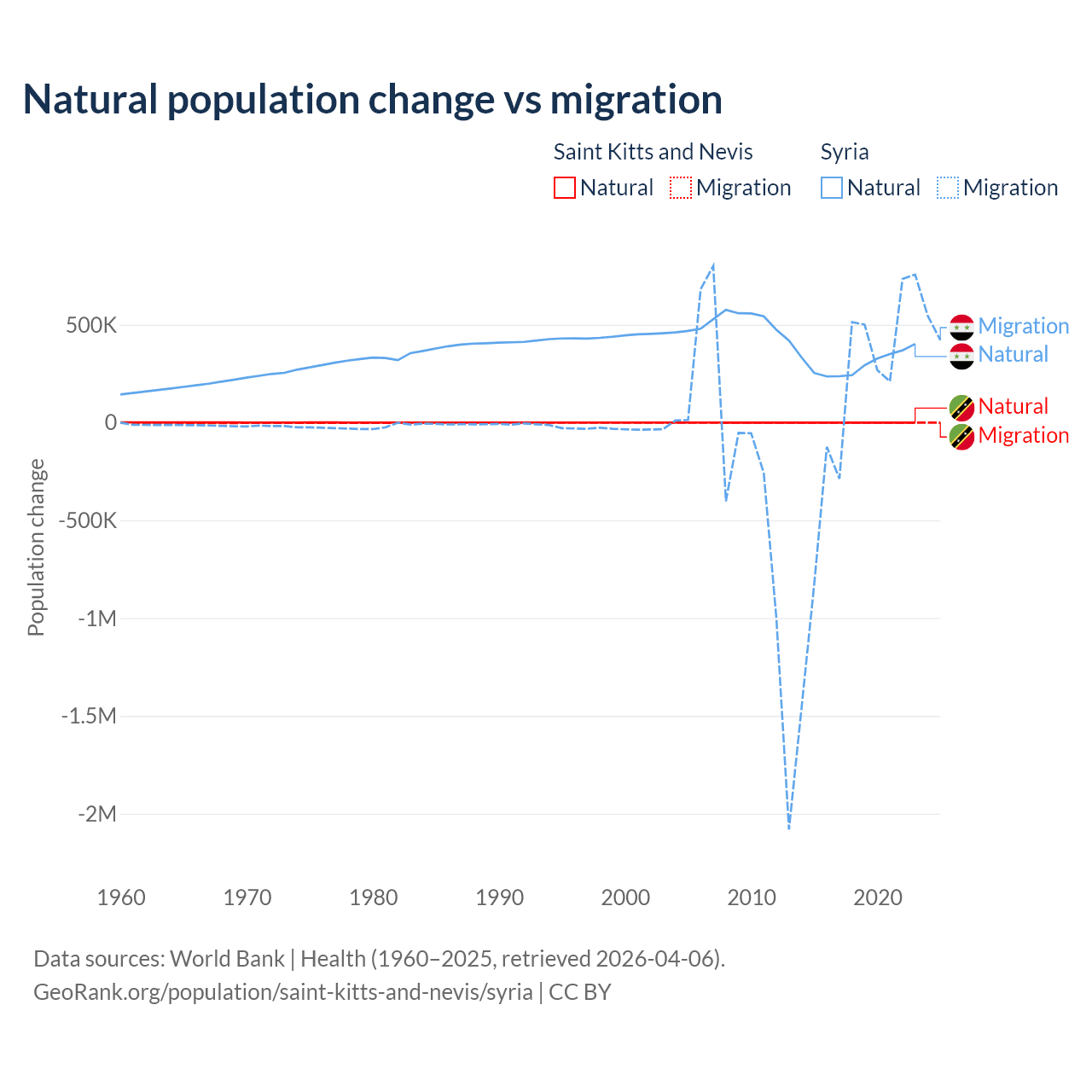Over the last 10 years, 44.9% of the population change in Saint Kitts and Nevis is from natural causes (a gain of 1,225 people) and 55.1% is from migration (a loss of 1,506 people). In Syria 91.3% is from natural causes (a gain of 3,047,621 people) and 8.72% is from migration (a gain of 291,069 people).