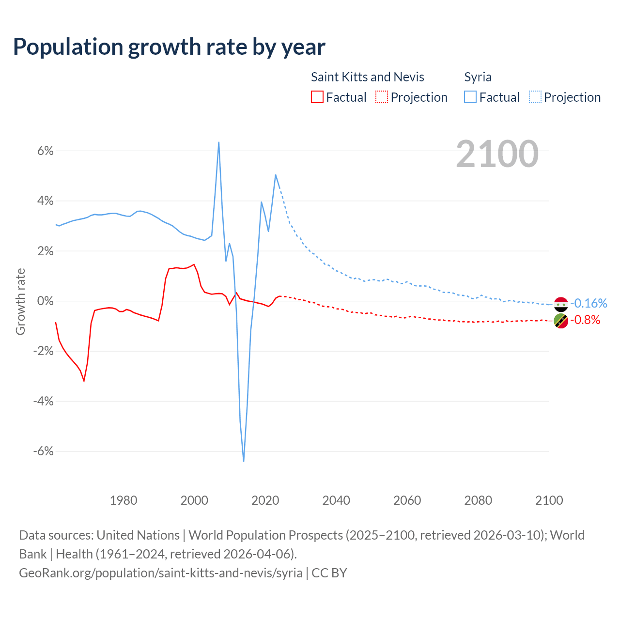 - For the last 10 years, Saint Kitts and Nevis has had an average growth rate of -0.04% per year vs +1.25% in Syria.