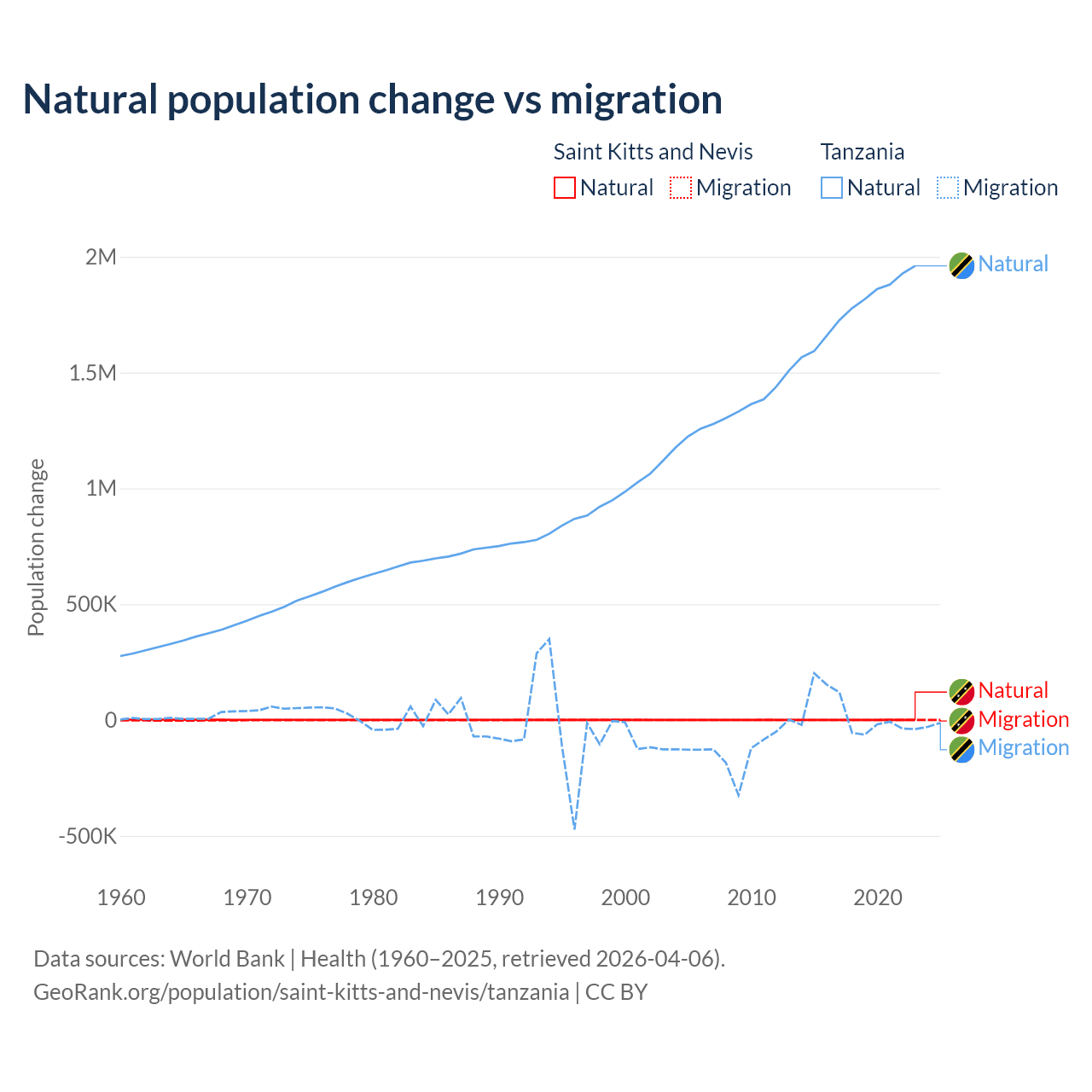 Over the last 10 years, 44.9% of the population change in Saint Kitts and Nevis is from natural causes (a gain of 1,225 people) and 55.1% is from migration (a loss of 1,506 people). In Tanzania 98.7% is from natural causes (a gain of 17,769,541 people) and 1.27% is from migration (a gain of 229,466 people).