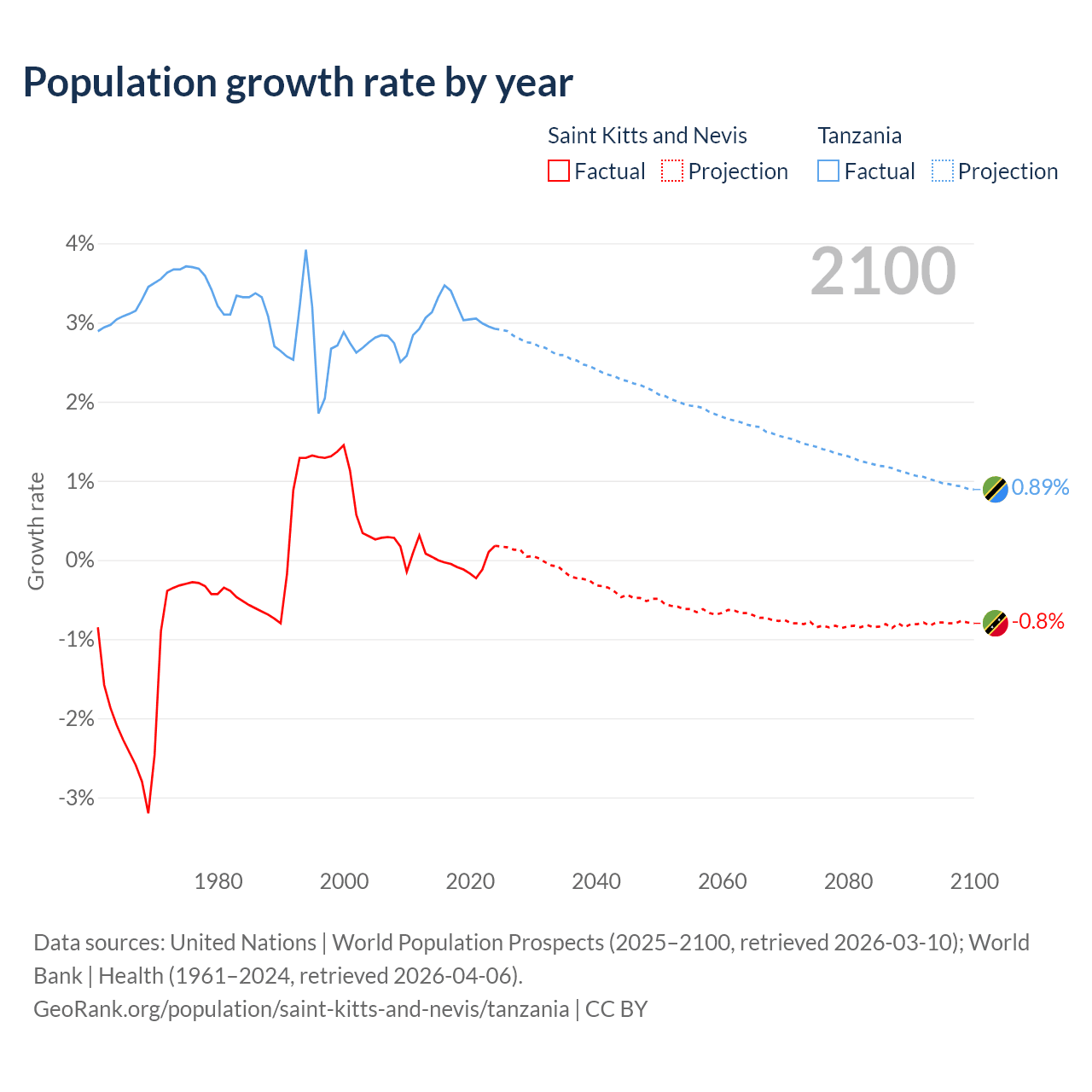 - For the last 10 years, Saint Kitts and Nevis has had an average growth rate of -0.04% per year vs +3.13% in Tanzania.