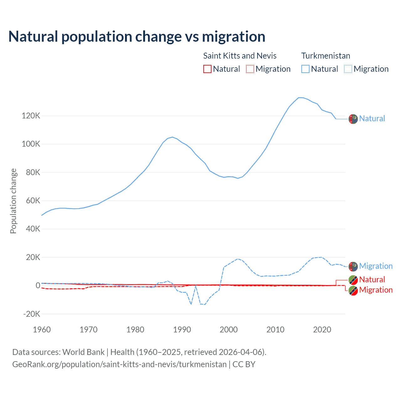 Over the last 10 years, 44.9% of the population change in Saint Kitts and Nevis is from natural causes (a gain of 1,225 people) and 55.1% is from migration (a loss of 1,506 people). In Turkmenistan 89.2% is from natural causes (a gain of 1,270,228 people) and 10.8% is from migration (a gain of 154,379 people).