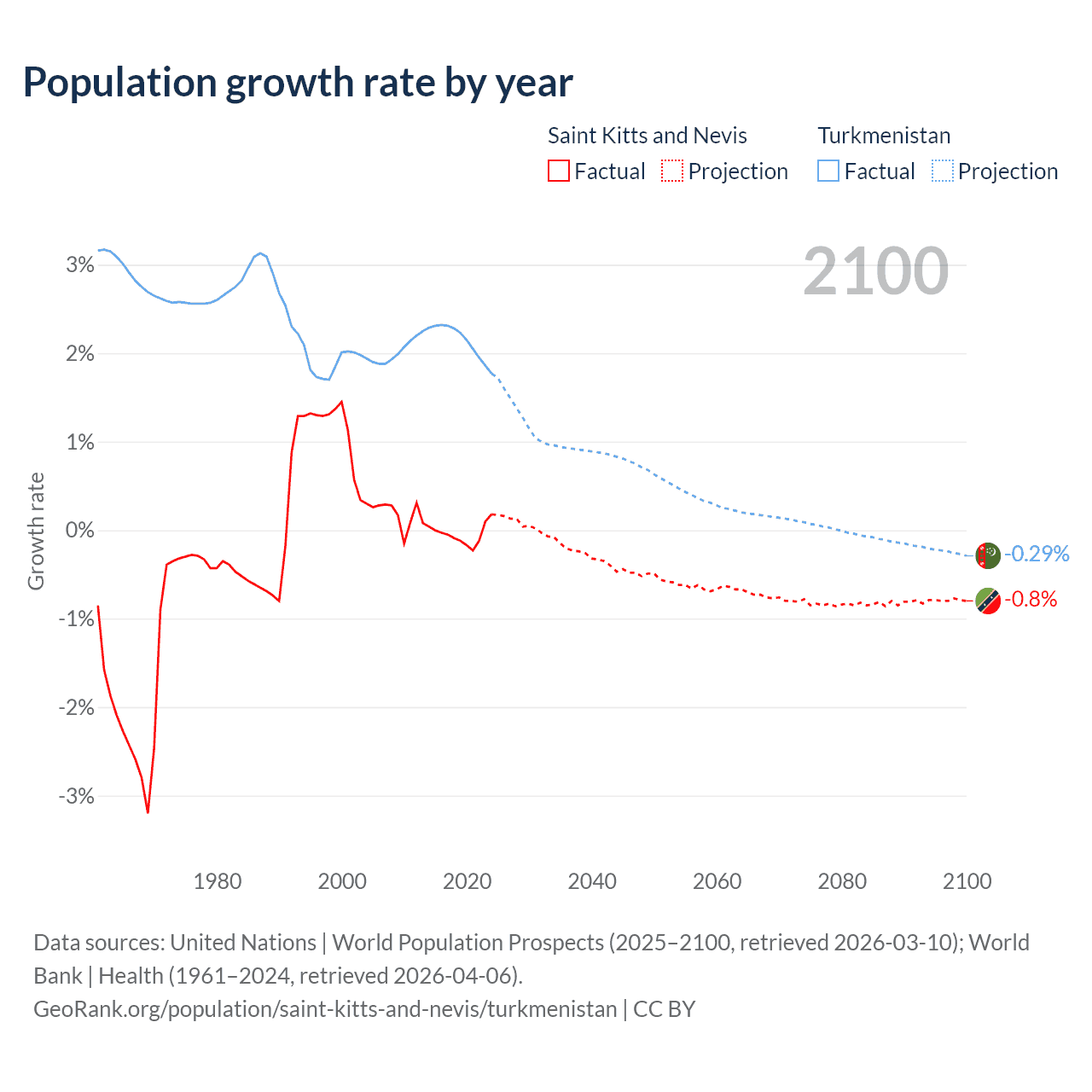 - For the last 10 years, Saint Kitts and Nevis has had an average growth rate of -0.04% per year vs +2.14% in Turkmenistan.