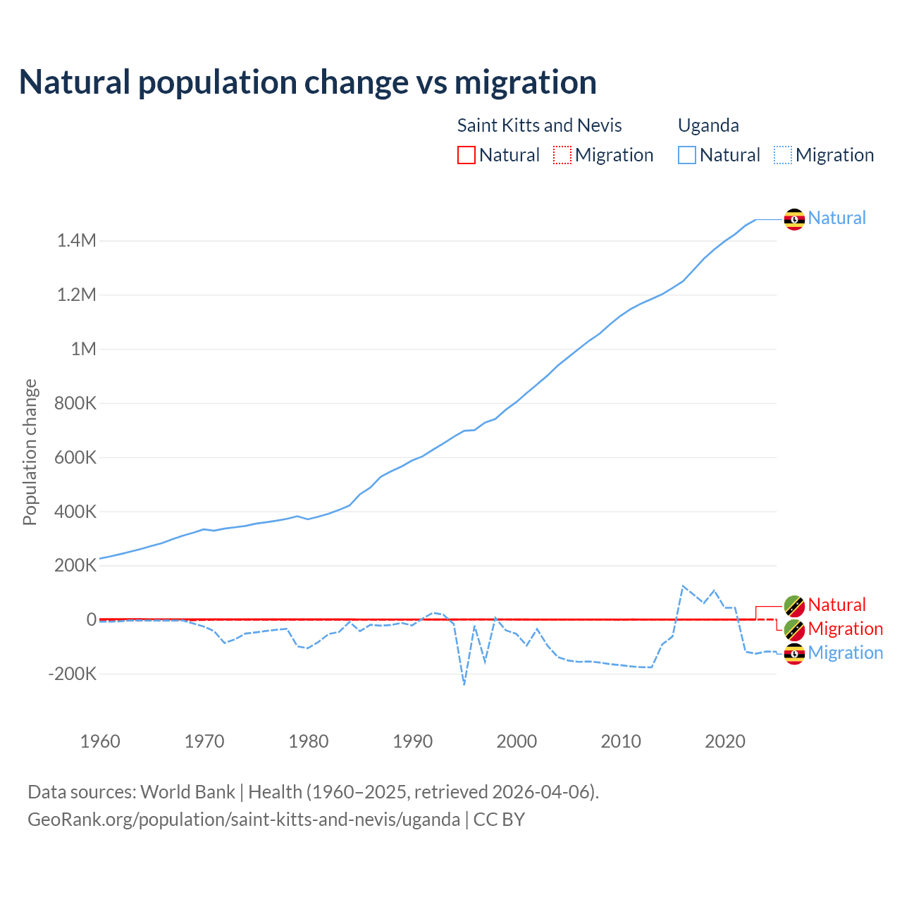 Over the last 10 years, 44.9% of the population change in Saint Kitts and Nevis is from natural causes (a gain of 1,225 people) and 55.1% is from migration (a loss of 1,506 people). In Uganda 99.5% is from natural causes (a gain of 13,419,712 people) and 0.53% is from migration (a gain of 71,457 people).