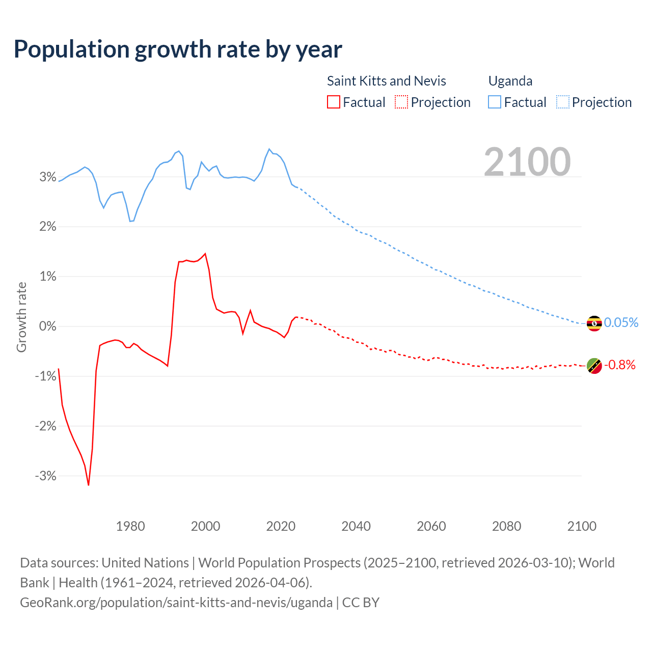 - For the last 10 years, Saint Kitts and Nevis has had an average growth rate of -0.04% per year vs +3.21% in Uganda.