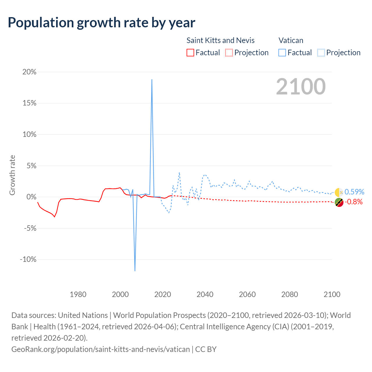 - For the last 10 years, Saint Kitts and Nevis has had an average growth rate of -0.04% per year vs +1.9% in the Vatican.