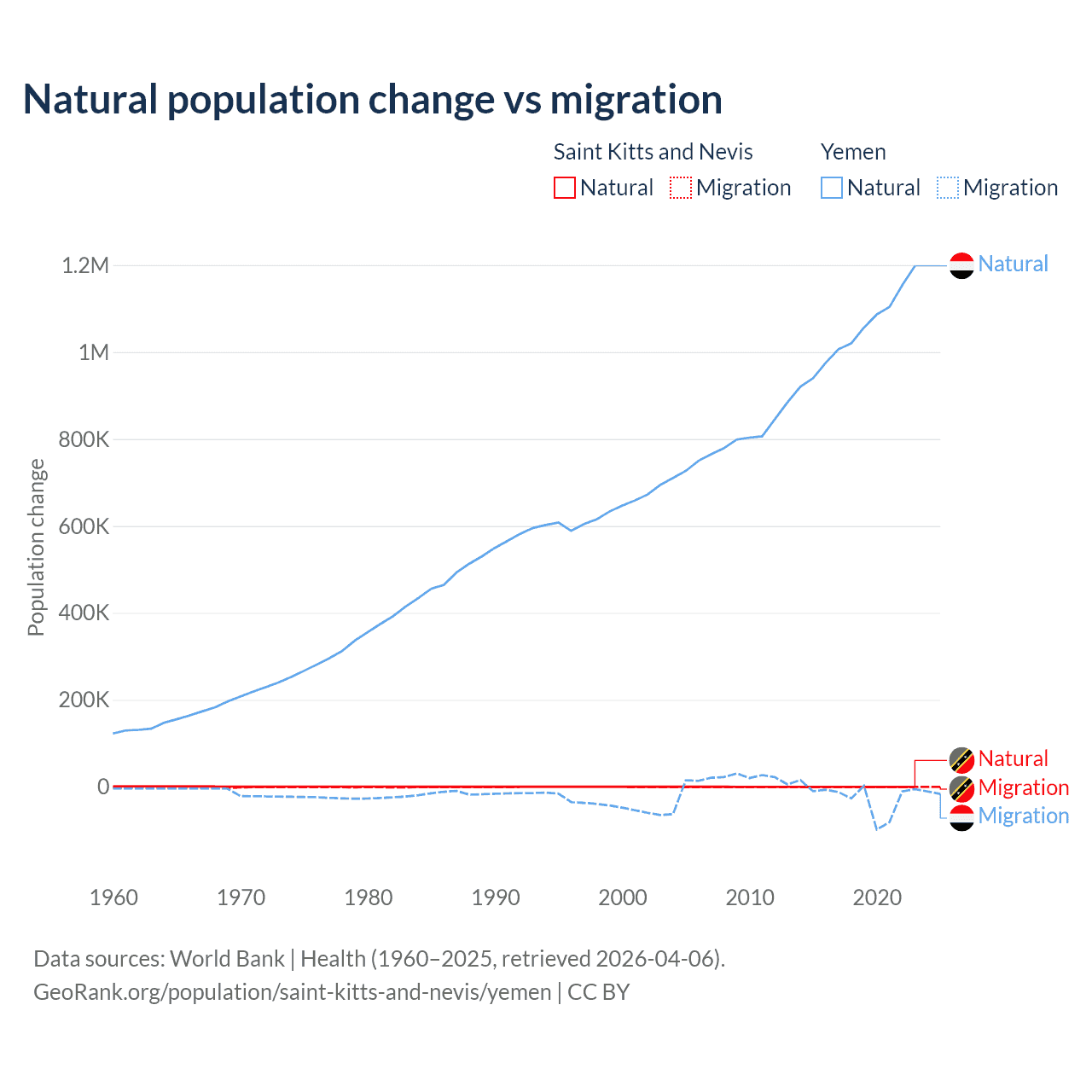 Over the last 10 years, 44.9% of the population change in Saint Kitts and Nevis is from natural causes (a gain of 1,225 people) and 55.1% is from migration (a loss of 1,506 people). In Yemen 97.8% is from natural causes (a gain of 10,460,813 people) and 2.17% is from migration (a loss of 231,814 people).