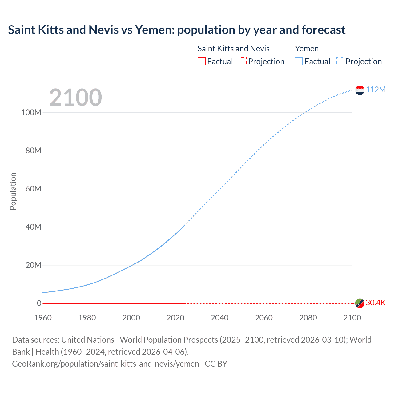 Saint Kitts and Nevis vs Yemen: population by year and forecast