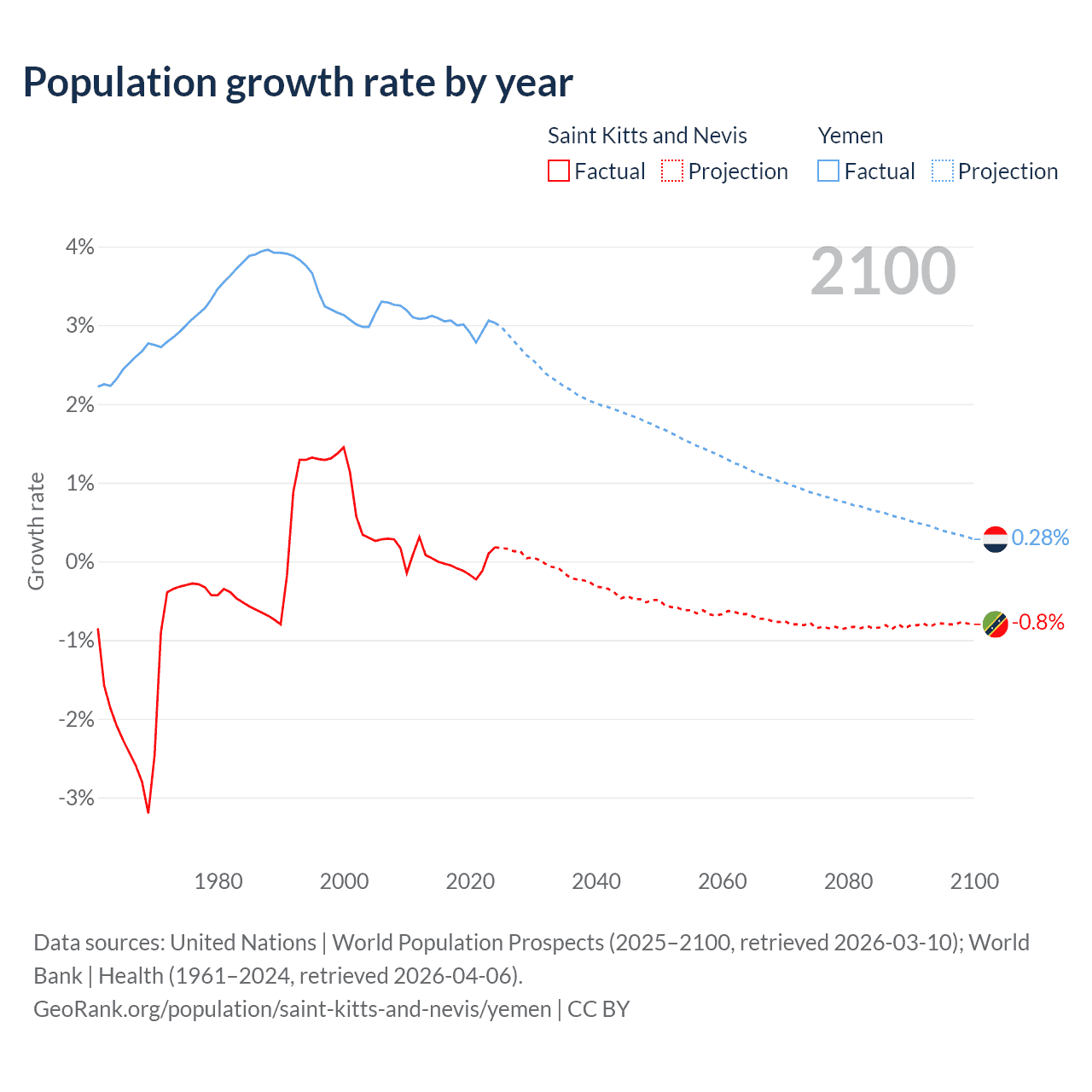 - For the last 10 years, Saint Kitts and Nevis has had an average growth rate of -0.04% per year vs +3% in Yemen.