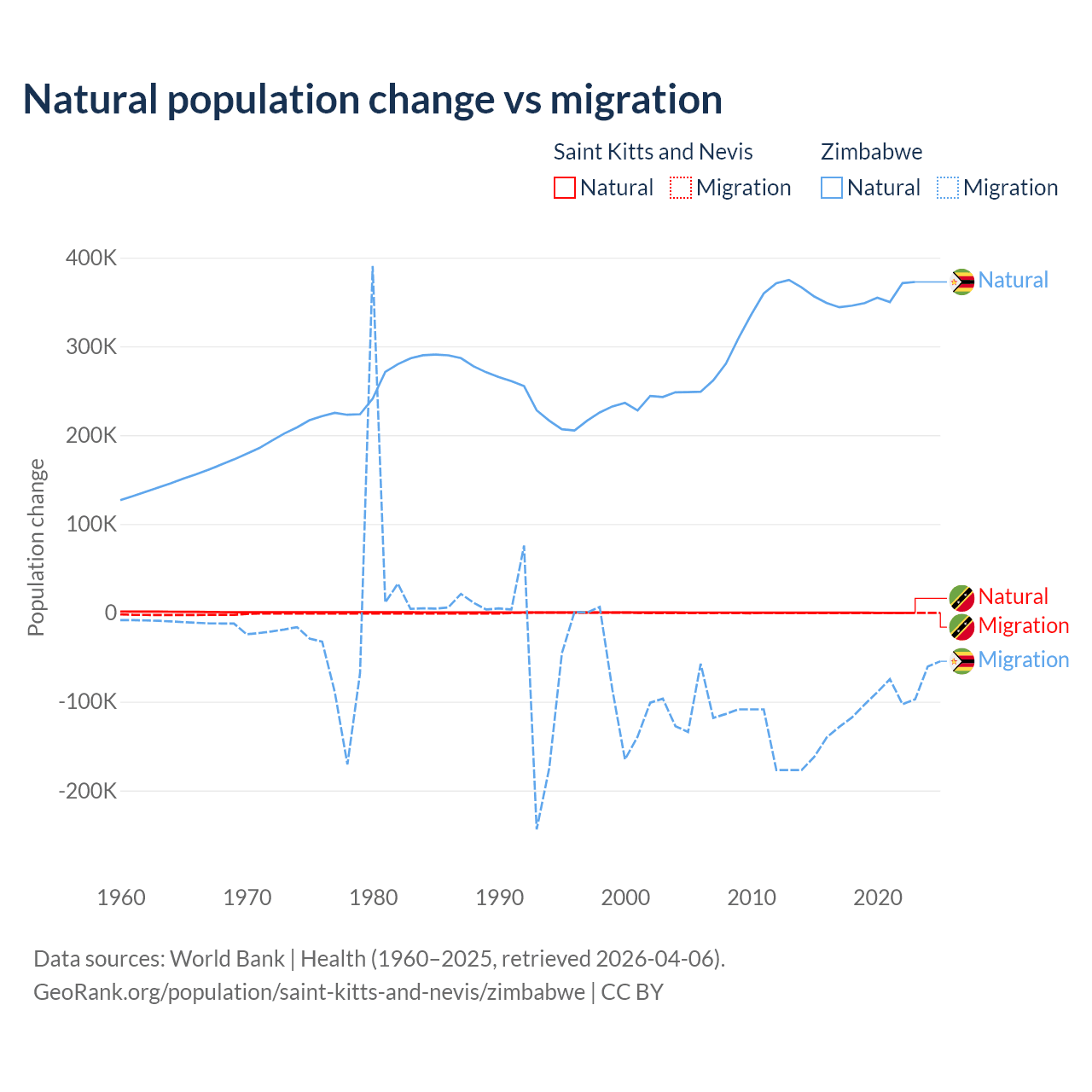 Over the last 10 years, 44.9% of the population change in Saint Kitts and Nevis is from natural causes (a gain of 1,225 people) and 55.1% is from migration (a loss of 1,506 people). In Zimbabwe 74.9% is from natural causes (a gain of 3,558,487 people) and 25.1% is from migration (a loss of 1,192,807 people).
