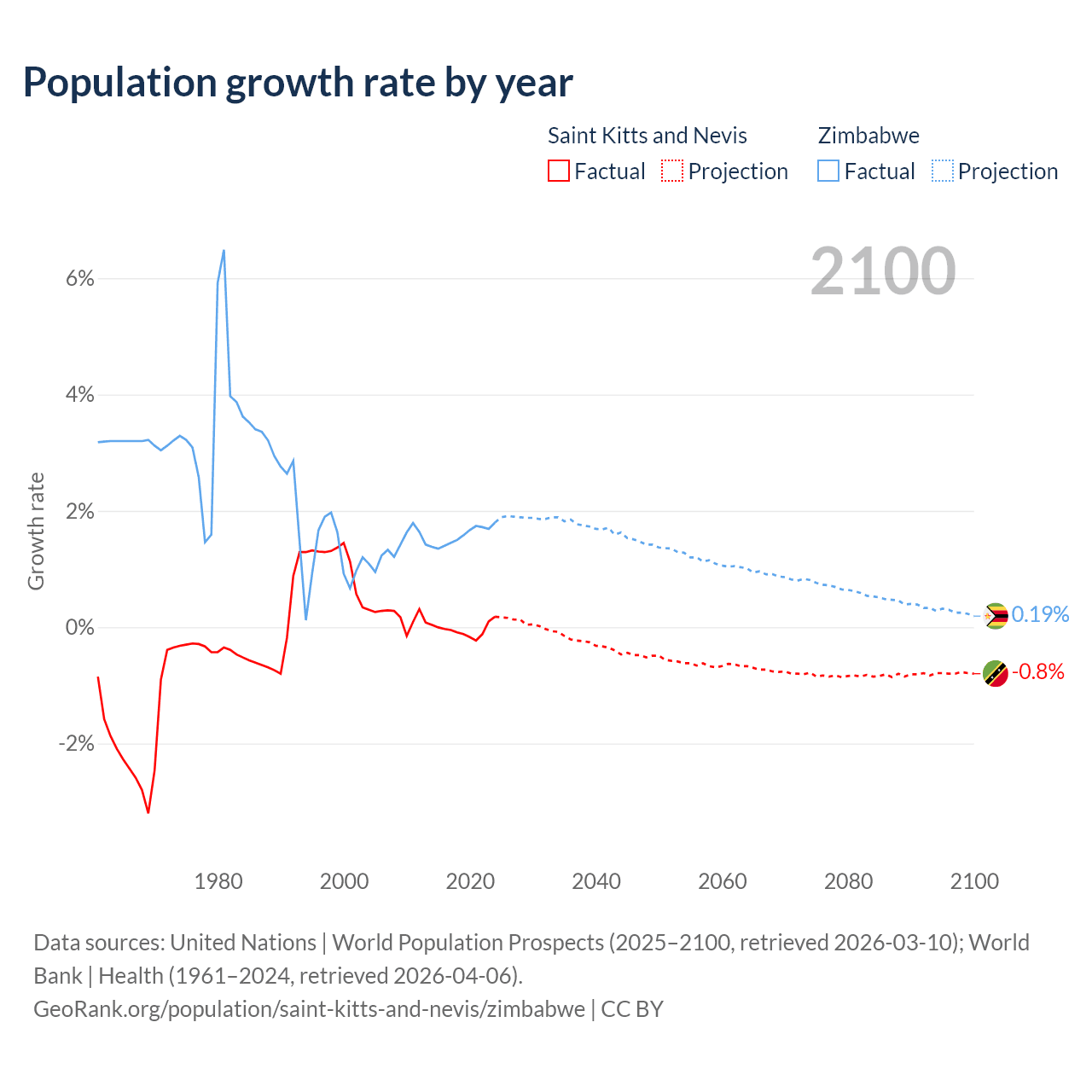 - For the last 10 years, Saint Kitts and Nevis has had an average growth rate of -0.04% per year vs +1.57% in Zimbabwe.