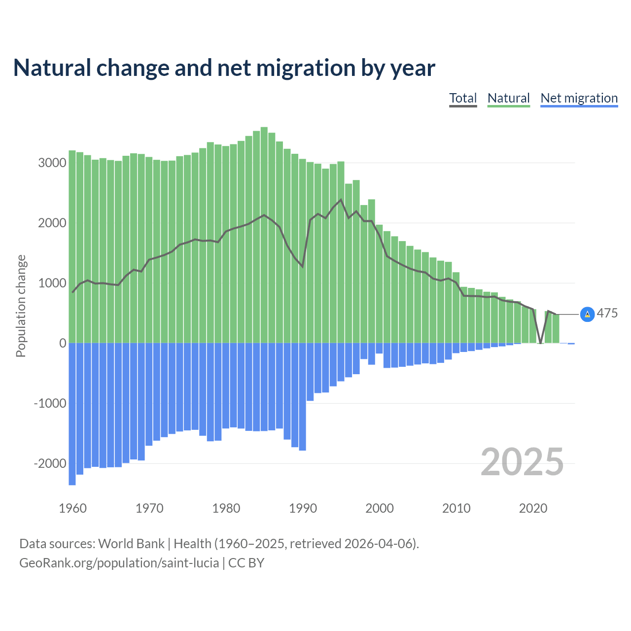 Over the last 10 years, 95.7% of the population change in Saint Lucia is from natural causes (a gain of 6,039 people) and 4.31% is from migration (a loss of 272 people).