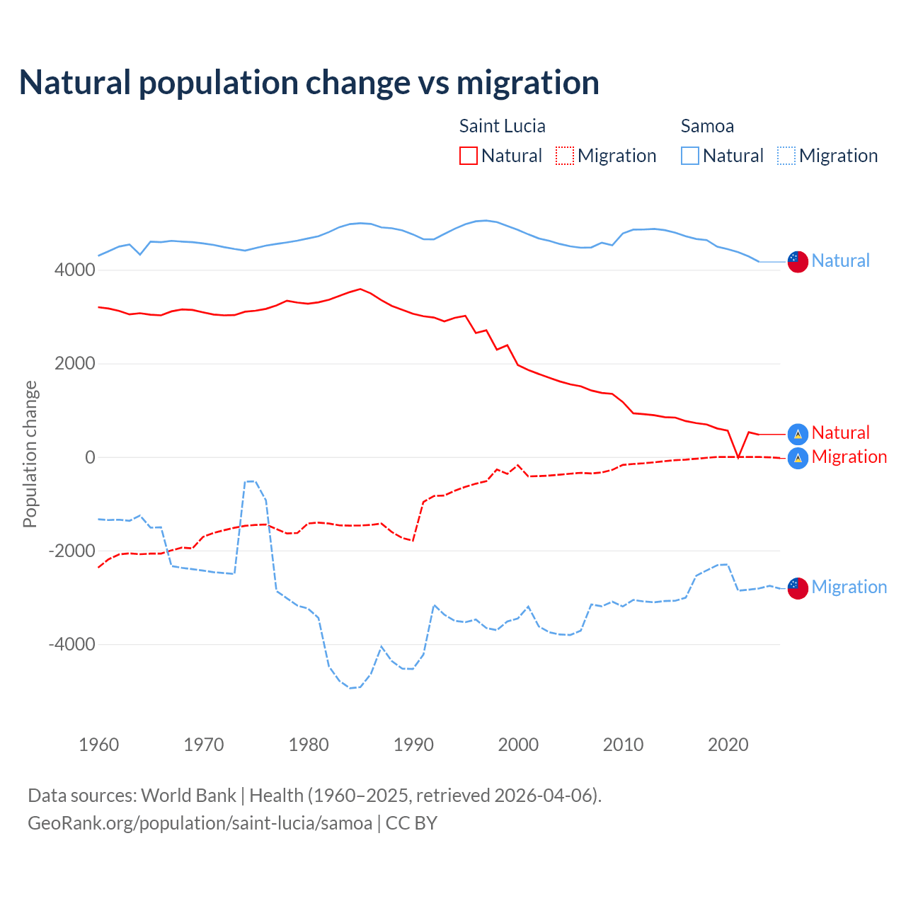 Over the last 10 years, 95.7% of the population change in Saint Lucia is from natural causes (a gain of 6,039 people) and 4.31% is from migration (a loss of 272 people). In Samoa 62.5% is from natural causes (a gain of 45,436 people) and 37.5% is from migration (a loss of 27,246 people).