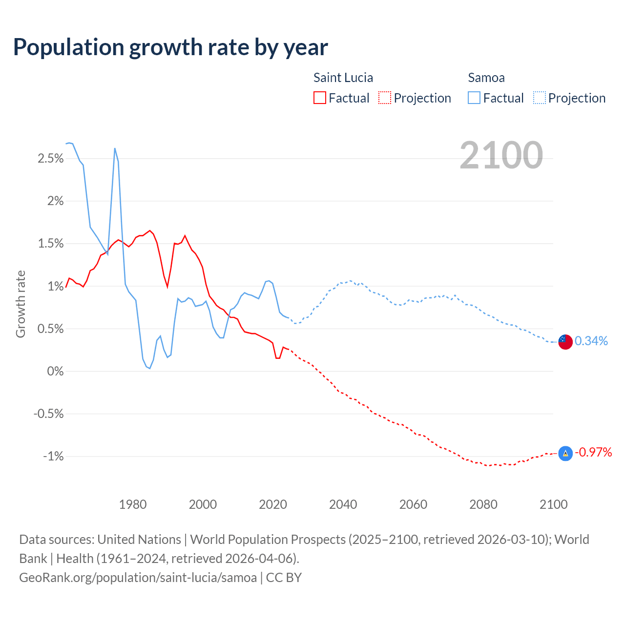- For the last 10 years, Saint Lucia has had an average growth rate of +0.33% per year vs +0.87% in Samoa.