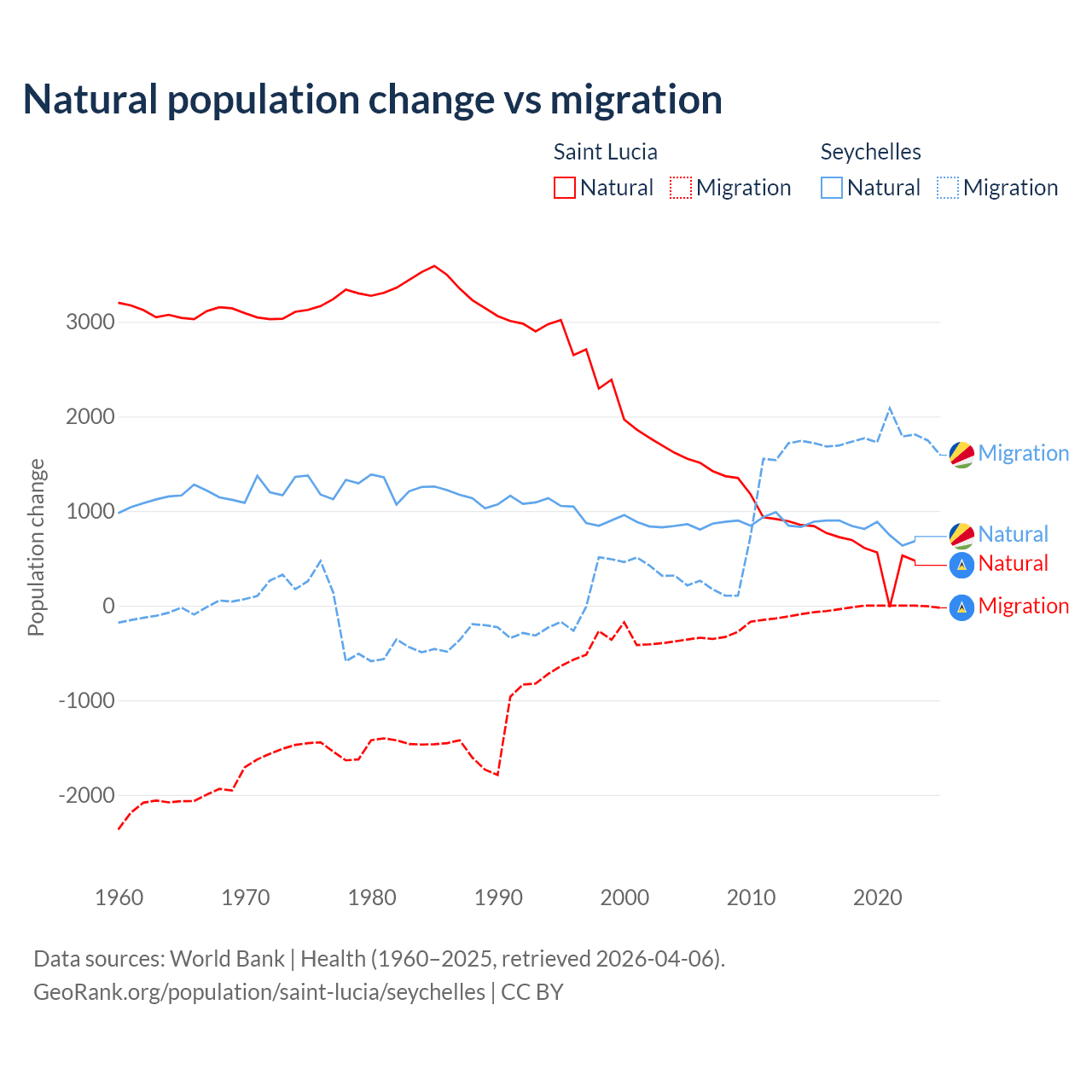Over the last 10 years, 95.7% of the population change in Saint Lucia is from natural causes (a gain of 6,039 people) and 4.31% is from migration (a loss of 272 people). In the Seychelles 31.4% is from natural causes (a gain of 8,122 people) and 68.6% is from migration (a gain of 17,748 people).