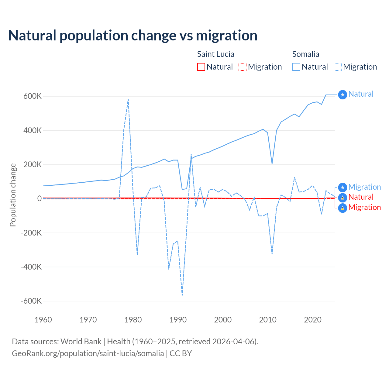 Over the last 10 years, 95.7% of the population change in Saint Lucia is from natural causes (a gain of 6,039 people) and 4.31% is from migration (a loss of 272 people). In Somalia 94.4% is from natural causes (a gain of 5,270,105 people) and 5.58% is from migration (a gain of 311,487 people).