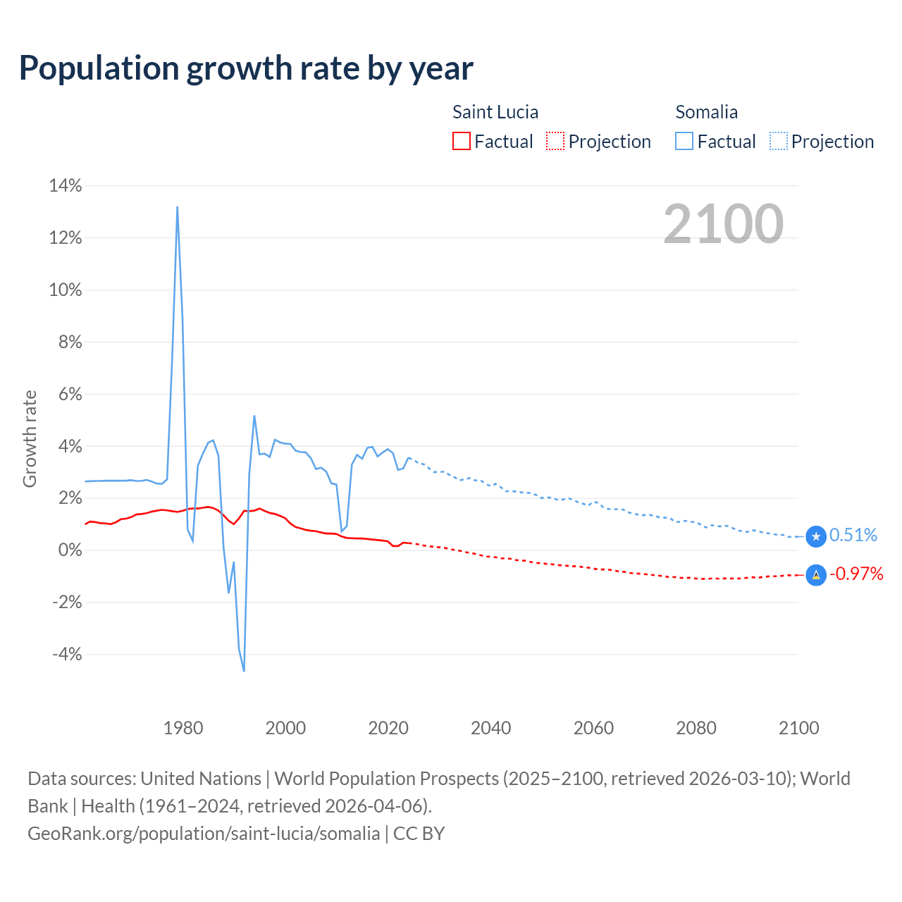- For the last 10 years, Saint Lucia has had an average growth rate of +0.33% per year vs +3.61% in Somalia.