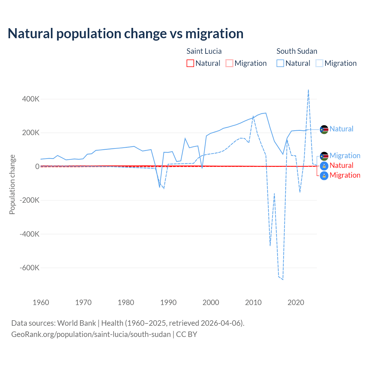 Over the last 10 years, 95.7% of the population change in Saint Lucia is from natural causes (a gain of 6,039 people) and 4.31% is from migration (a loss of 272 people). In South Sudan 57.4% is from natural causes (a gain of 1,792,135 people) and 42.6% is from migration (a loss of 1,329,606 people).