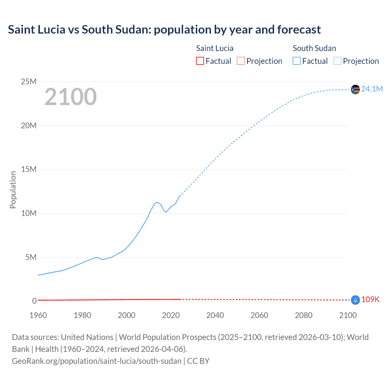 Saint Lucia vs South Sudan: population by year and forecast
