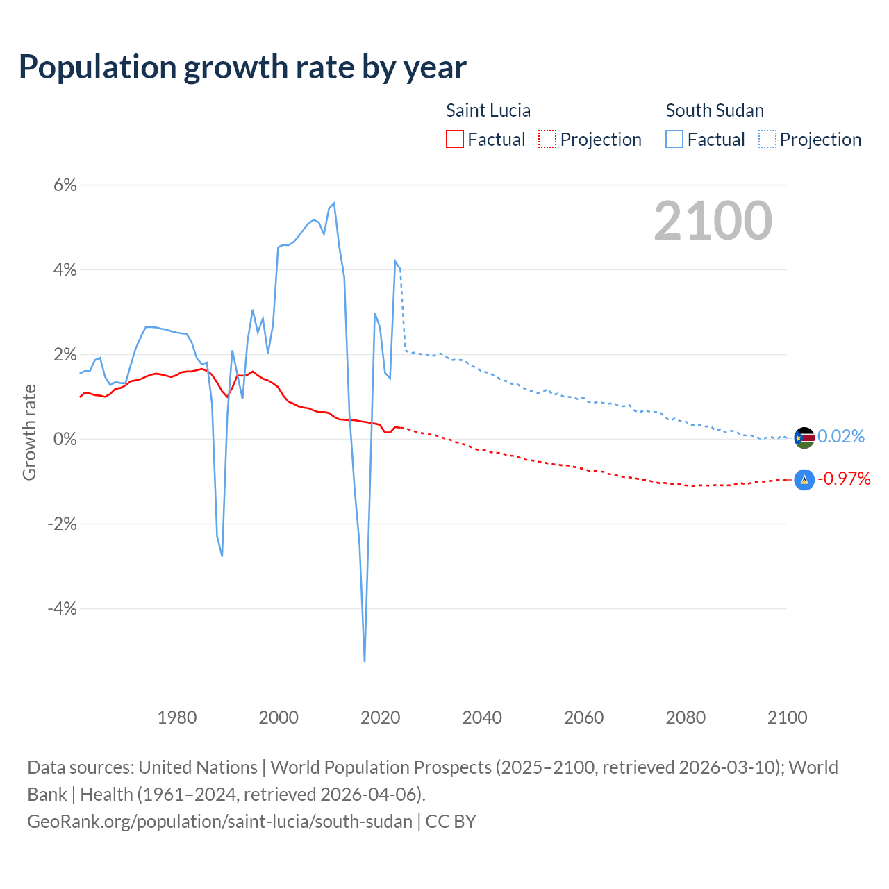 - For the last 10 years, Saint Lucia has had an average growth rate of +0.33% per year vs +0.65% in South Sudan.
