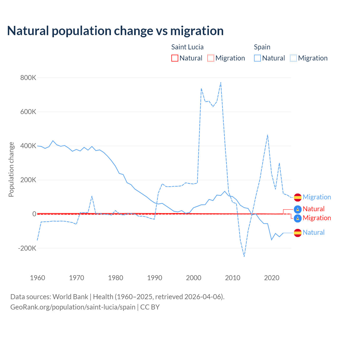 Over the last 10 years, 95.7% of the population change in Saint Lucia is from natural causes (a gain of 6,039 people) and 4.31% is from migration (a loss of 272 people). In Spain 25.8% is from natural causes (a loss of 627,829 people) and 74.2% is from migration (a gain of 1,810,127 people).