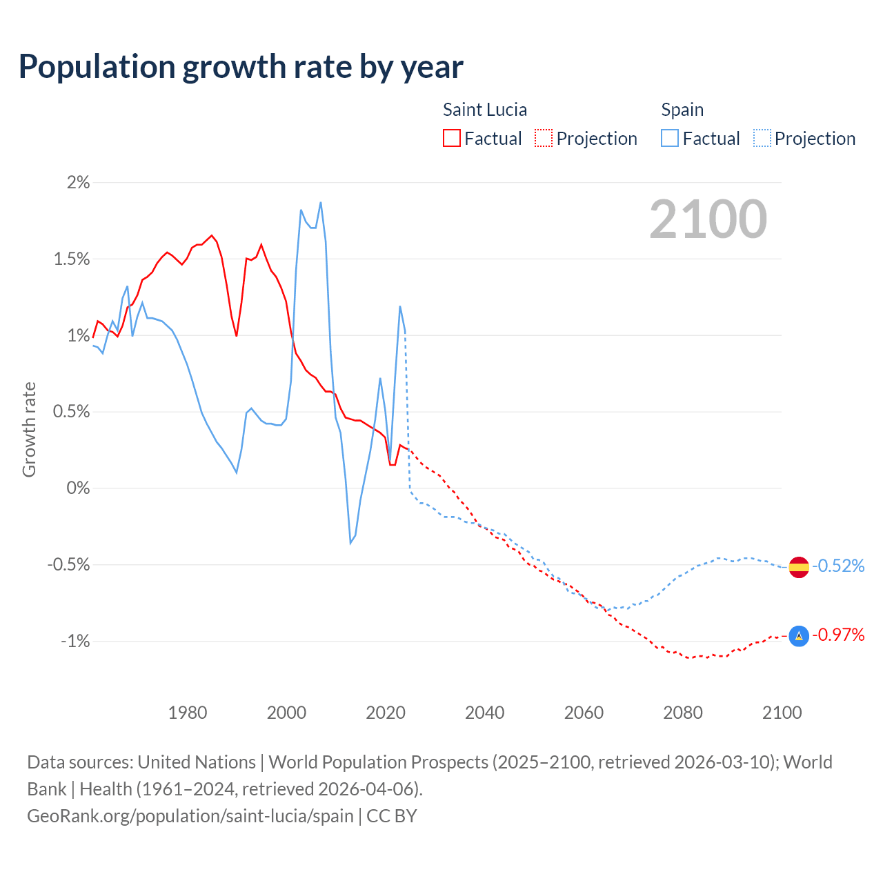 - For the last 10 years, Saint Lucia has had an average growth rate of +0.33% per year vs +0.43% in Spain.